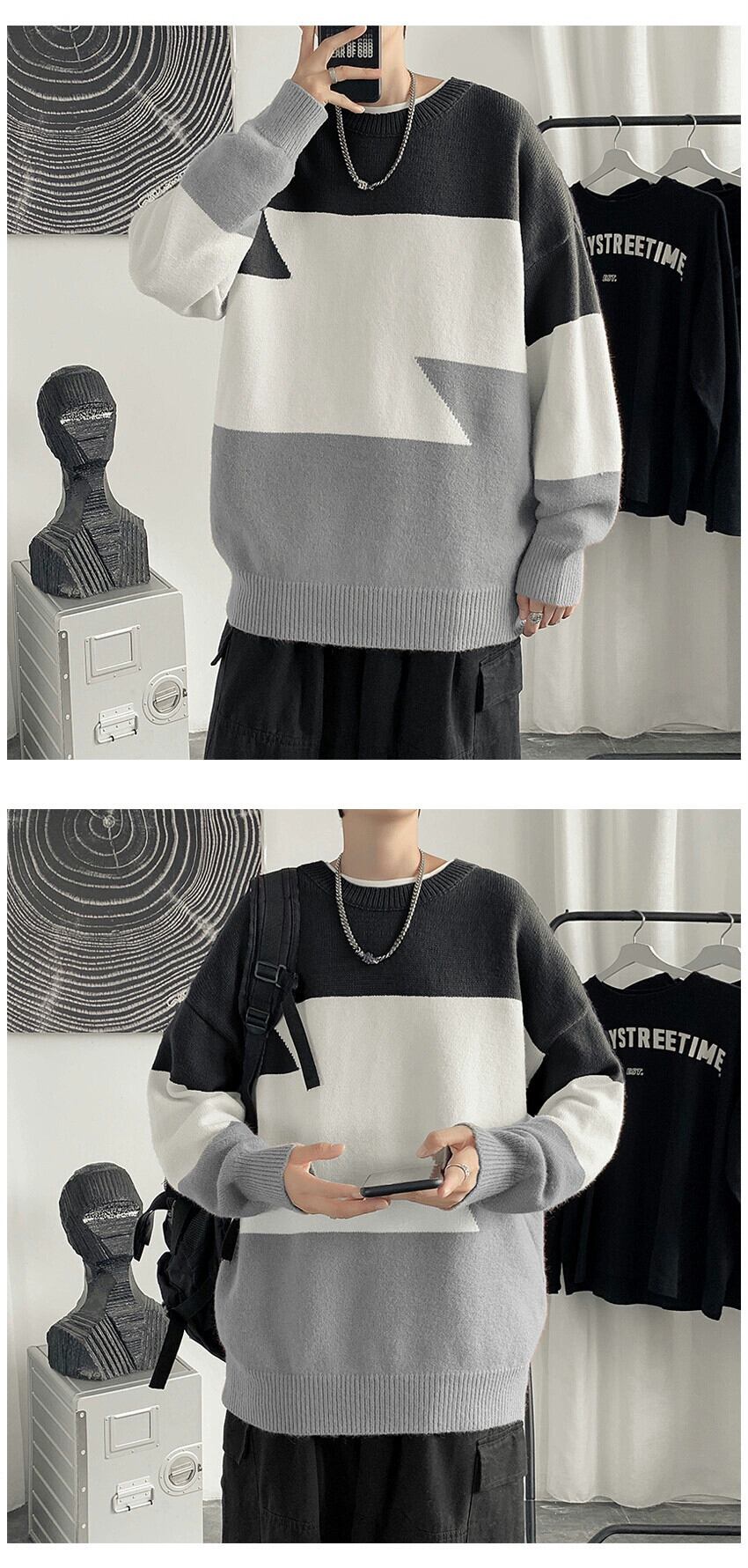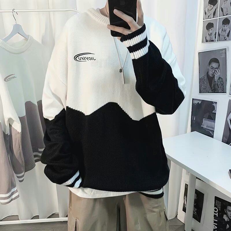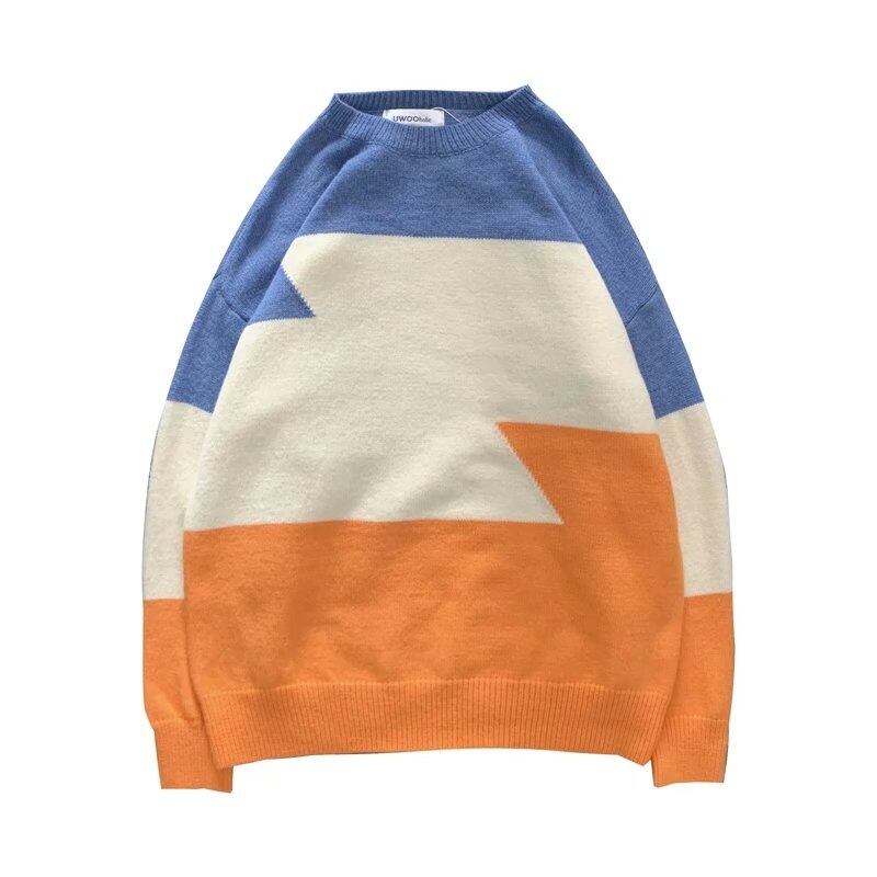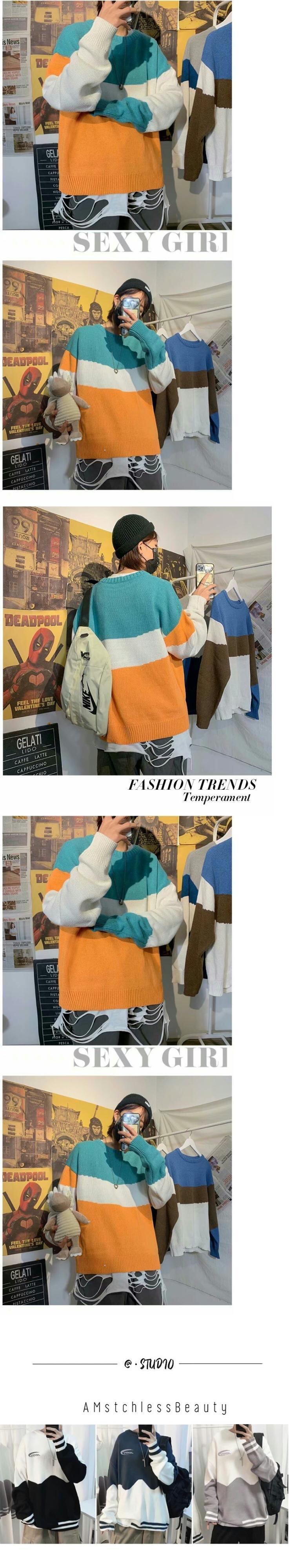 カラーブロックセーター男子学生プルオーバーセーター秋冬ストライプカップル怠惰な風長袖ウール服 ロング オータム 秋物 ウィンター 冬物 1285142988048420
