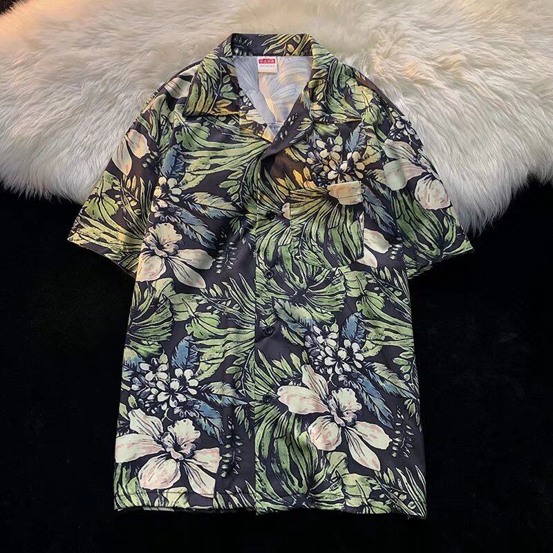 レトロ油絵キューバカラープリント半袖シャツ男女カップル香港スタイルヴィンテージハワイアンビーチシャツ ビンテージ 1285166854088805