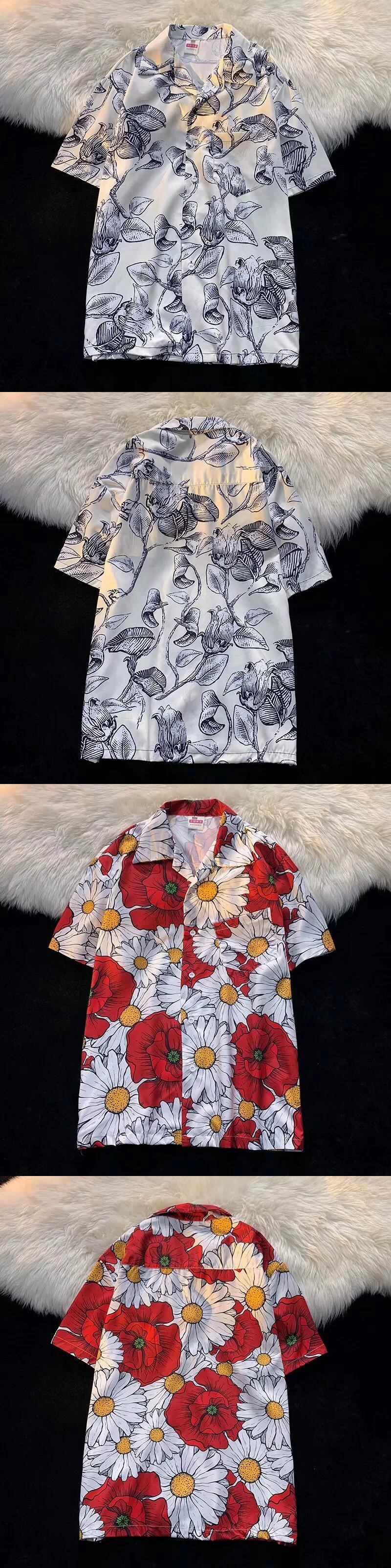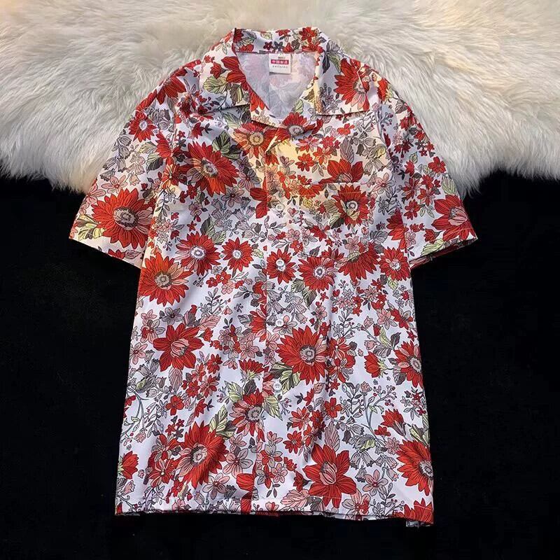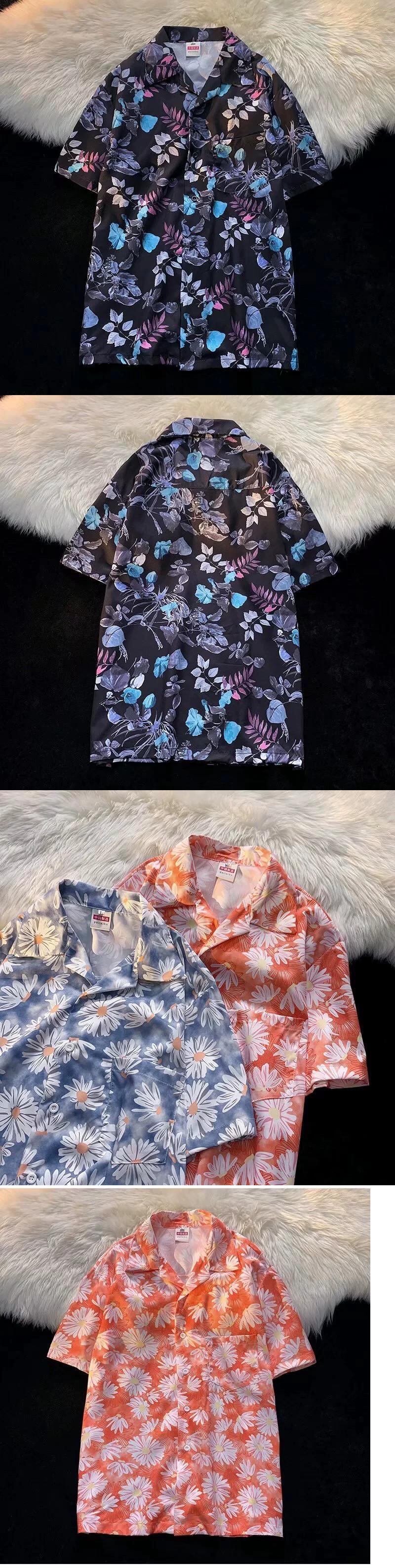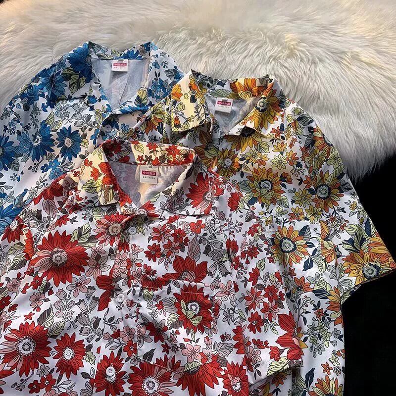 ese レトロニッチ楽しいプリント半袖キューバ襟フラワーシャツ男性と女性香港スタイルストリートカジュアルカップルシャツ フラワーデザイン 1285190891603525