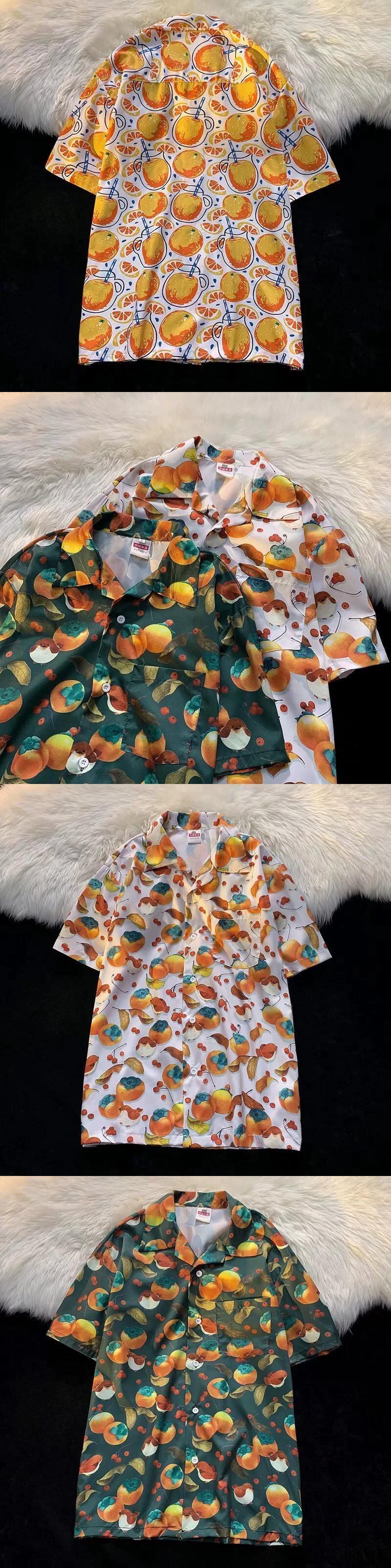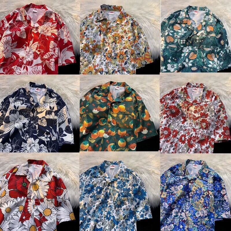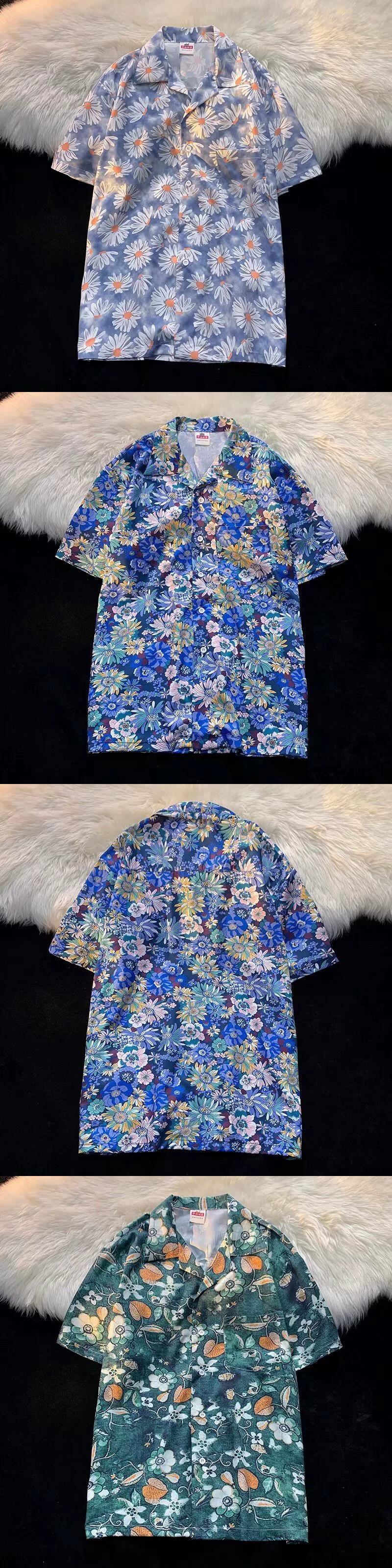 ese レトロニッチ楽しいプリント半袖キューバ襟フラワーシャツ男性と女性香港スタイルストリートカジュアルカップルシャツ フラワーデザイン 1285190891603525