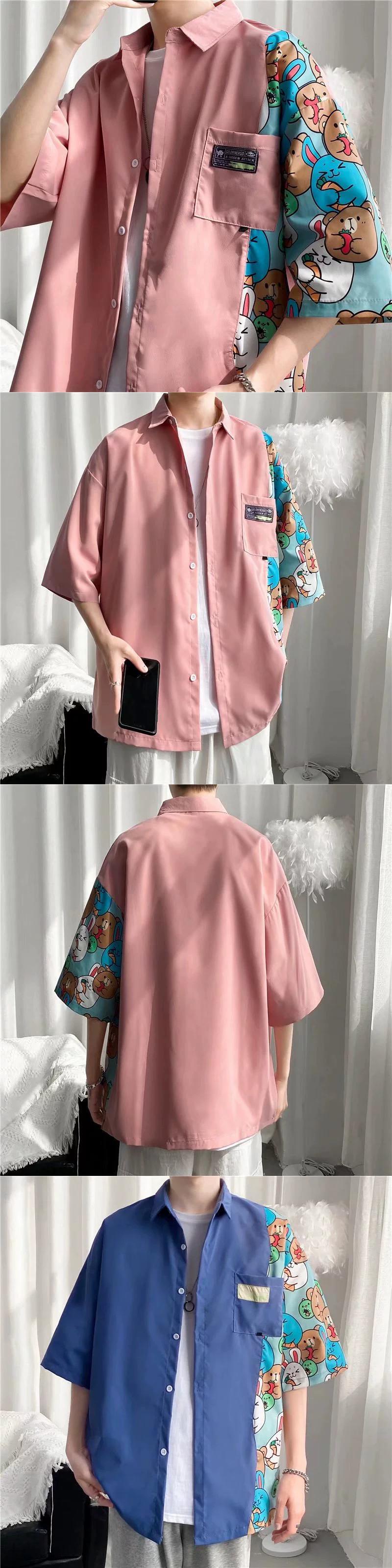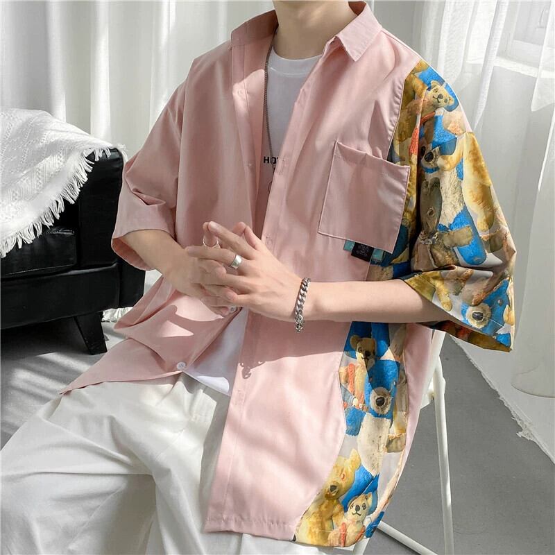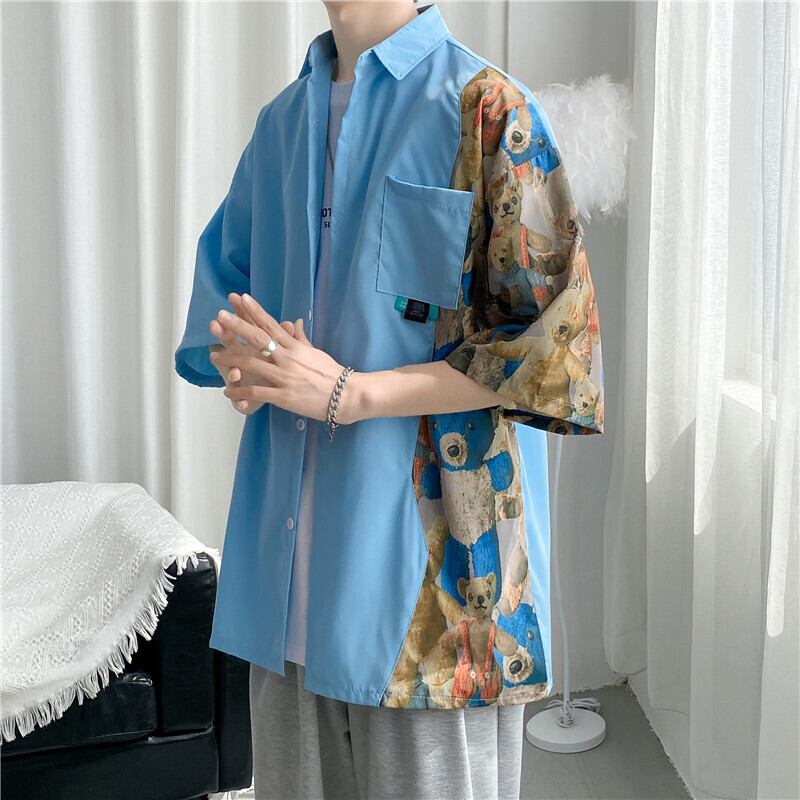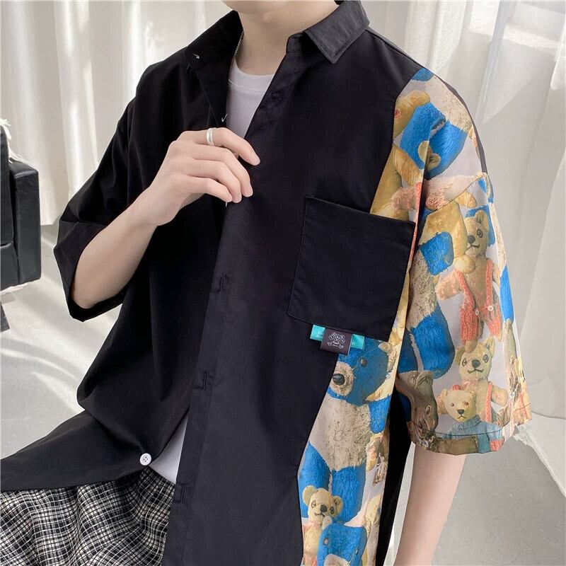 夏のメンズ半袖シャツスタイル楽しい漫画ステッチ ese 潮ブランド学生薄セクションアイスシルク人格シャツ サマー 夏物 1285134731910057