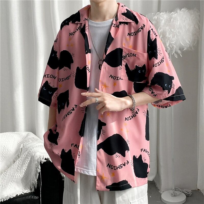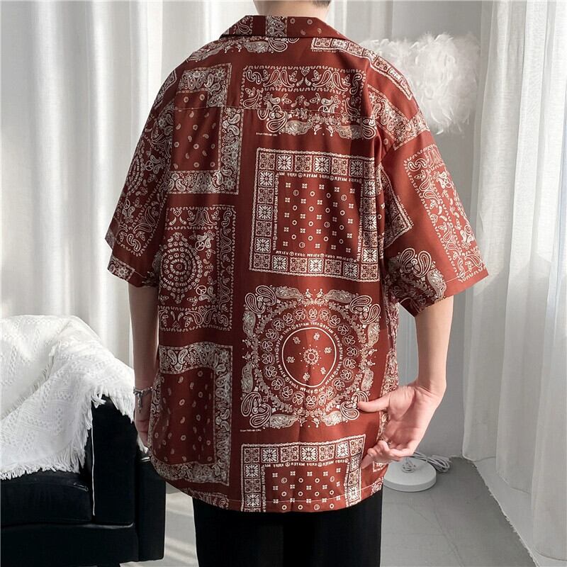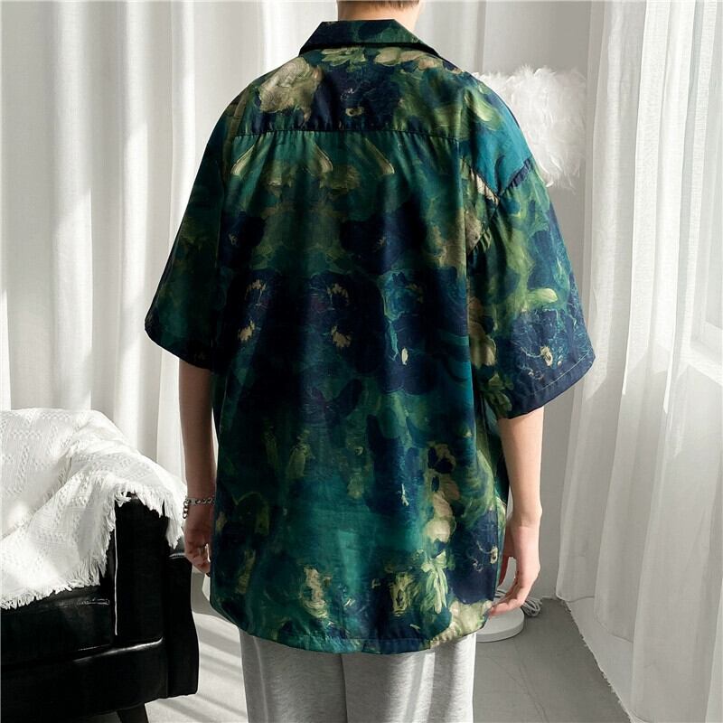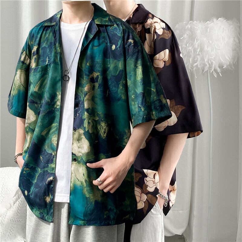 アイスシルクレトロ油絵フルプリント半袖キューバ襟ヴィンテージフラワーシャツメンズルーズハワイアンビーチシャツ フラワーデザイン ビンテージ 1285153237461765