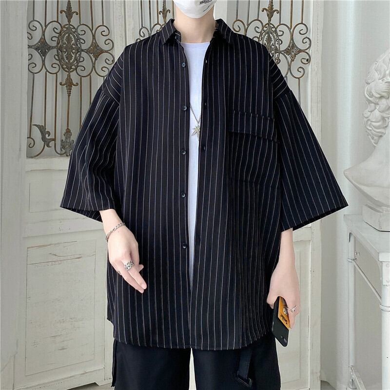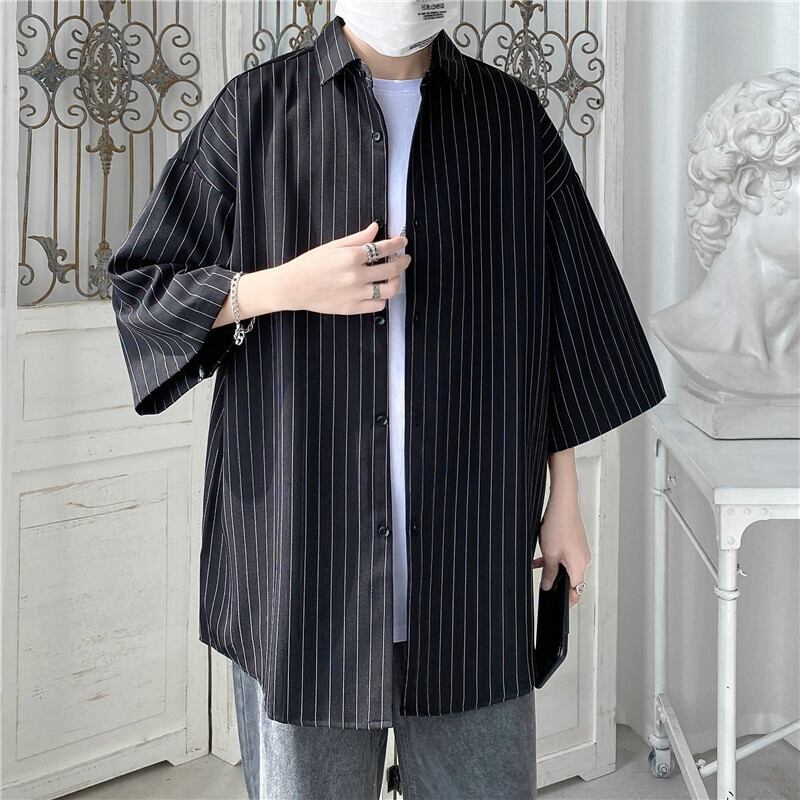レトロな縦ストライプ半袖シャツ夏のカップル香港スタイルのトレンディなオールマッチ半袖怠惰なシャツイン サマー 夏物 1285176597989130