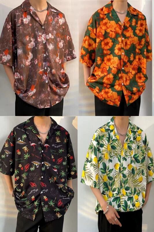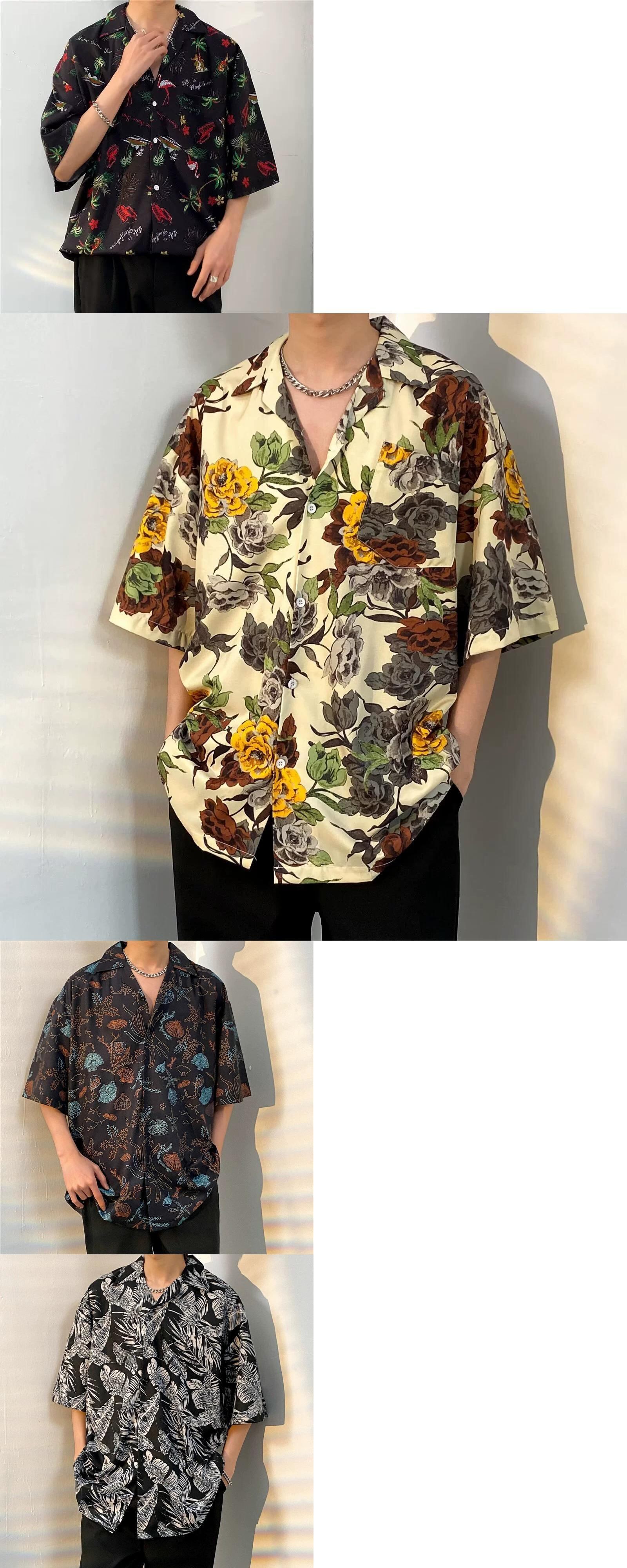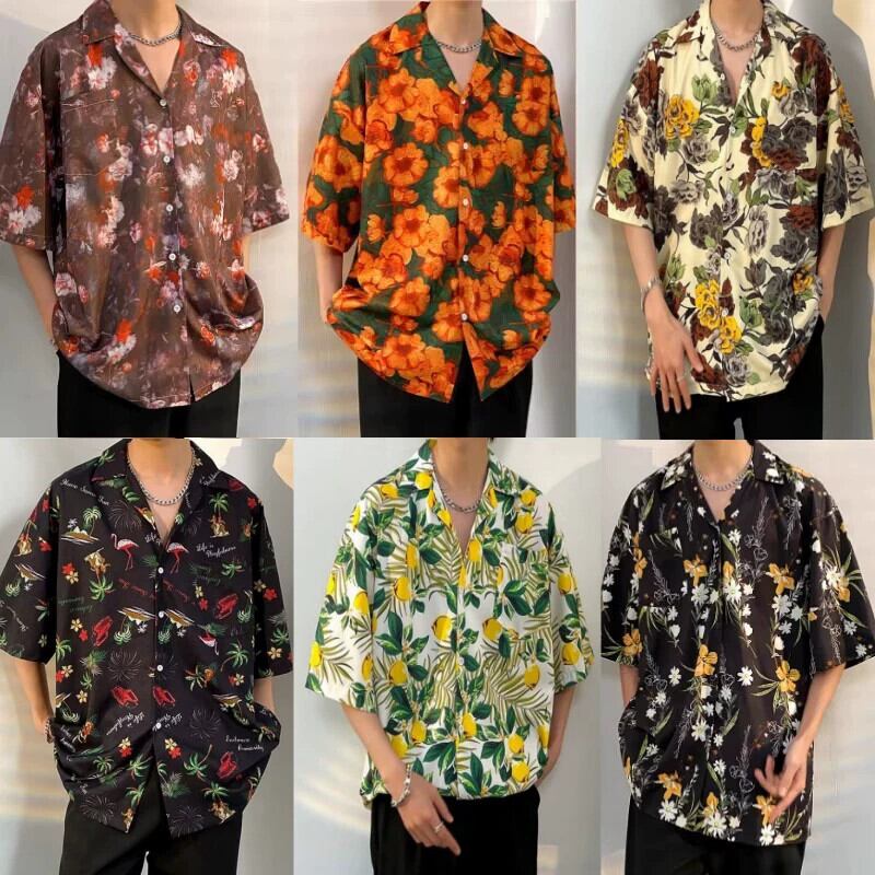 香港スタイルレトロビーチアイスシルクフラワーシャツ半袖タイハワイアンスタイルキューバ襟ならず者ハンサムルーズカップルシャツ フラワーデザイン 1285191172328112