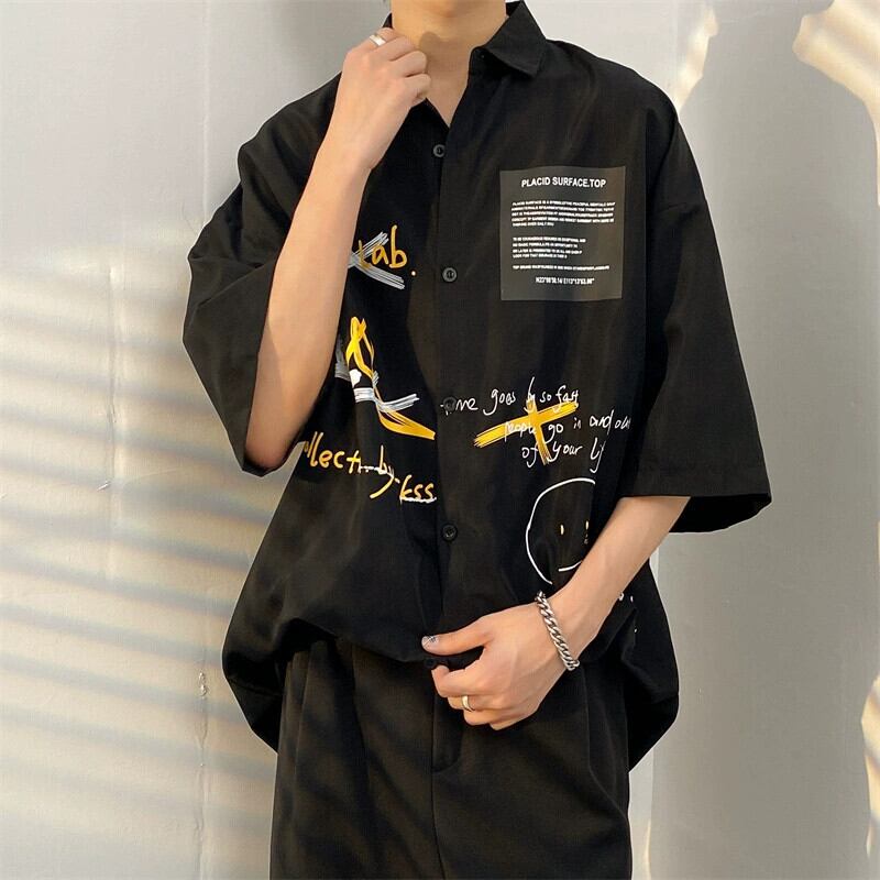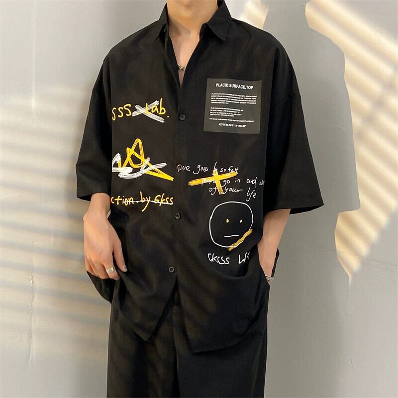 ese 落書きプリント半袖シャツメンズトレンディな香港スタイルルーズな性格悪党ハンサムなシャツジャケットセットマッチングスーツ 1285164273353858