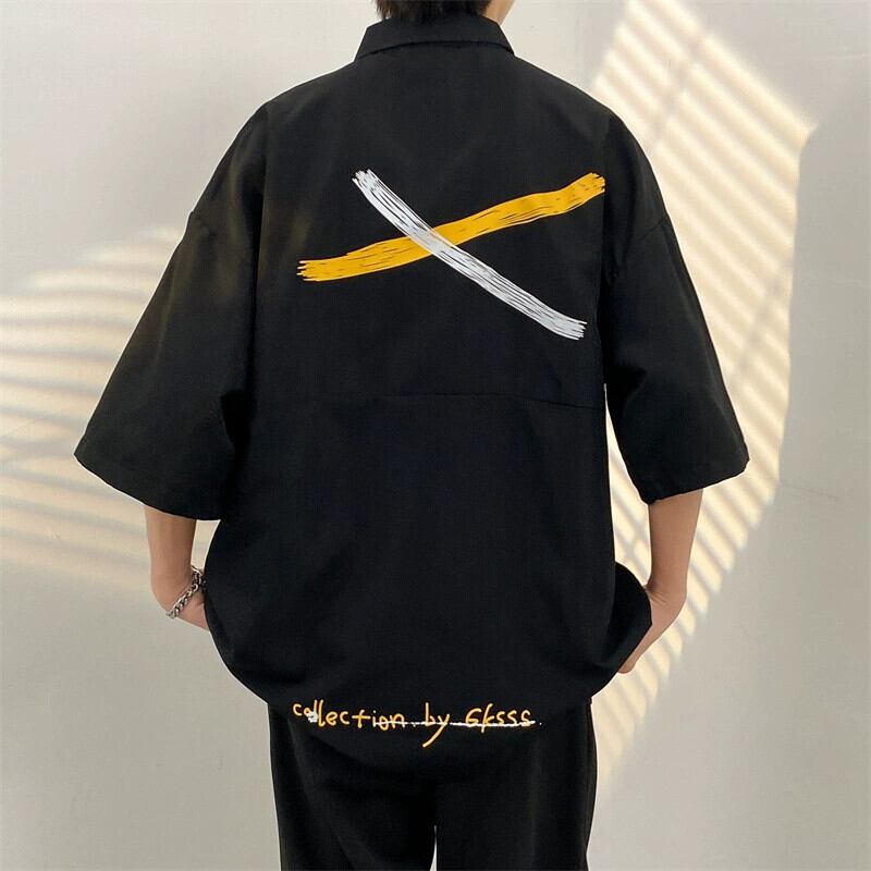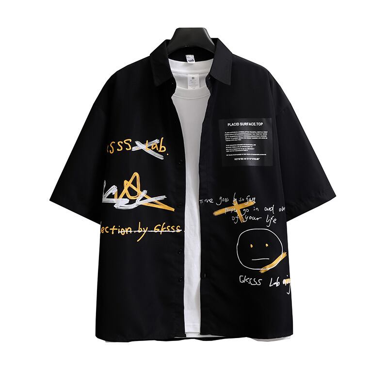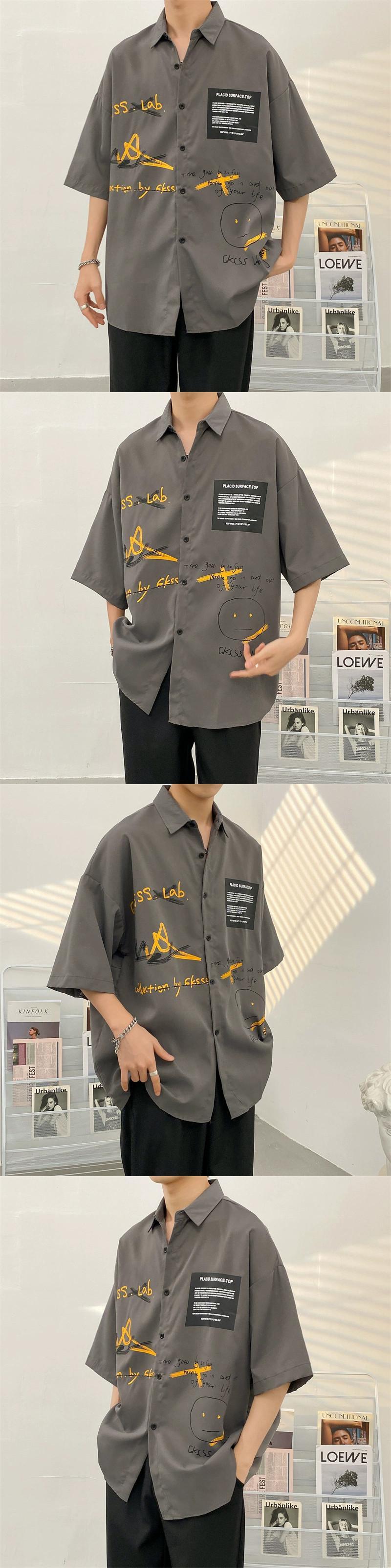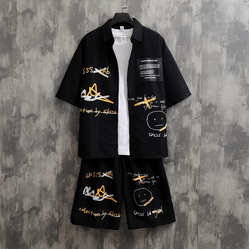 香港スタイル落書き半袖シャツメンズ夏カジュアルスーツイントレンドスタイル悪党ハンサムコロケーション潮ブランドスーツ サマー 夏物 1285134838887752
