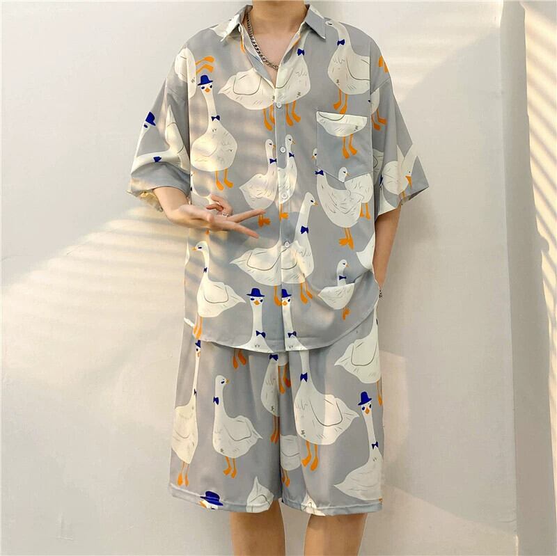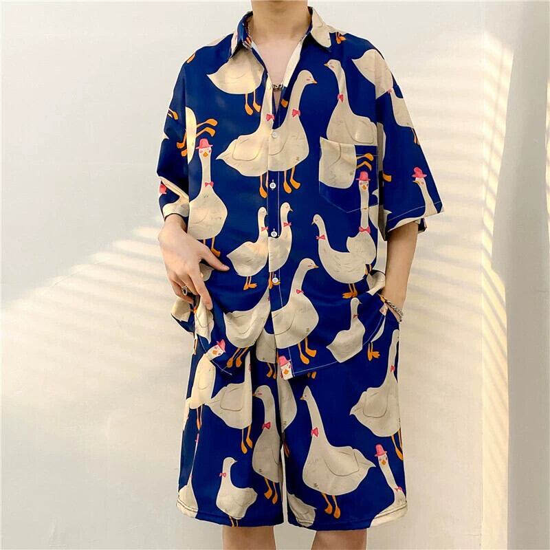 ハワイアンフラワーシャツメンズ半袖ルーズ大きいサイズレトロビーチシャツハンサムカジュアルアイスシルクスーツショーツメンズ 大きめサイズ ブルマー フラワーデザイン 1285192993004895