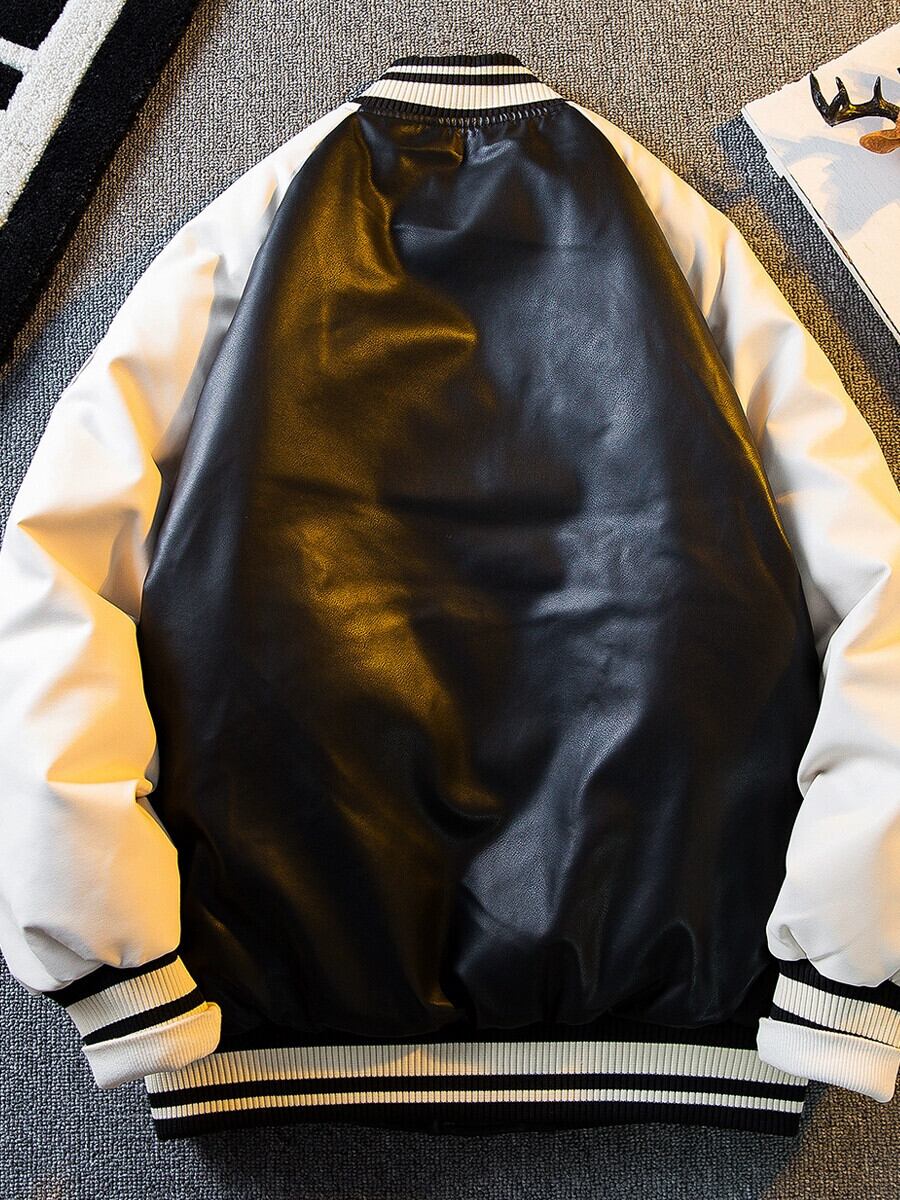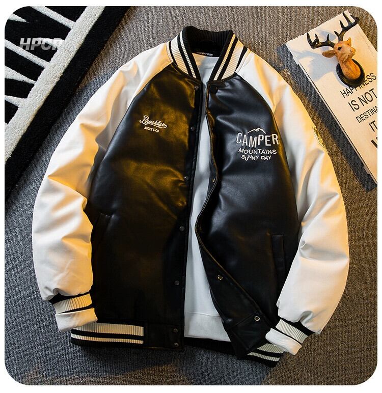 Hengpai トレンディな冬レトロ対照的なカラーステッチ pu レザーコットンジャケットメンズアメリカントレンディなブランド野球ジャケットジャケットメンズコットンジャケット ウィンター 冬物 3381921220900078