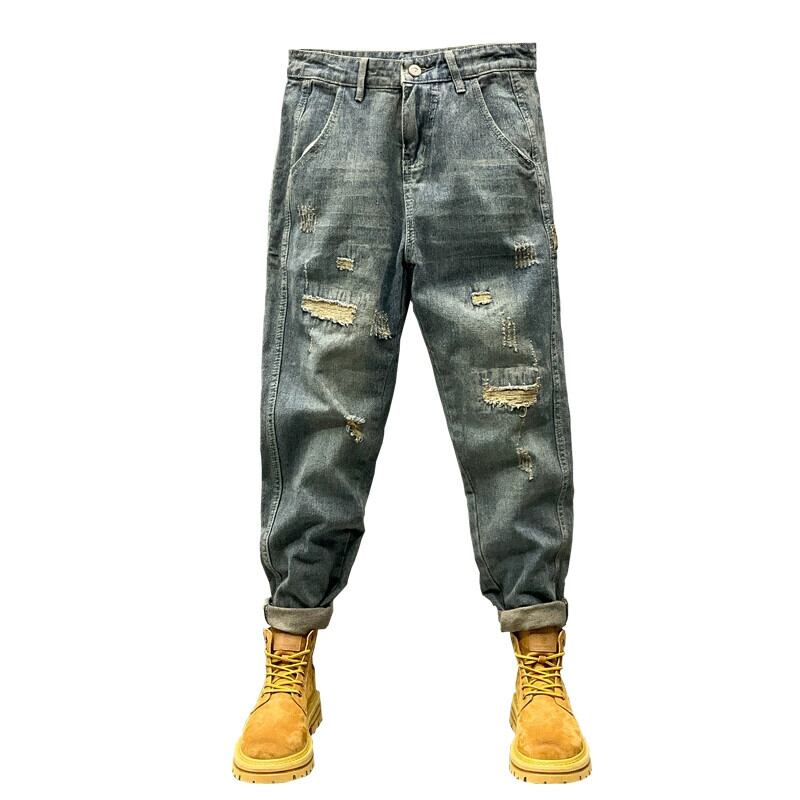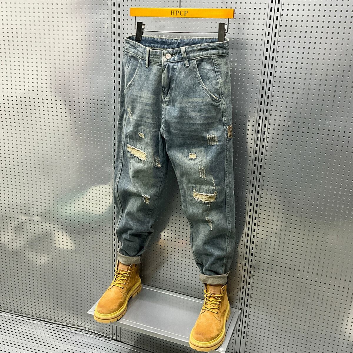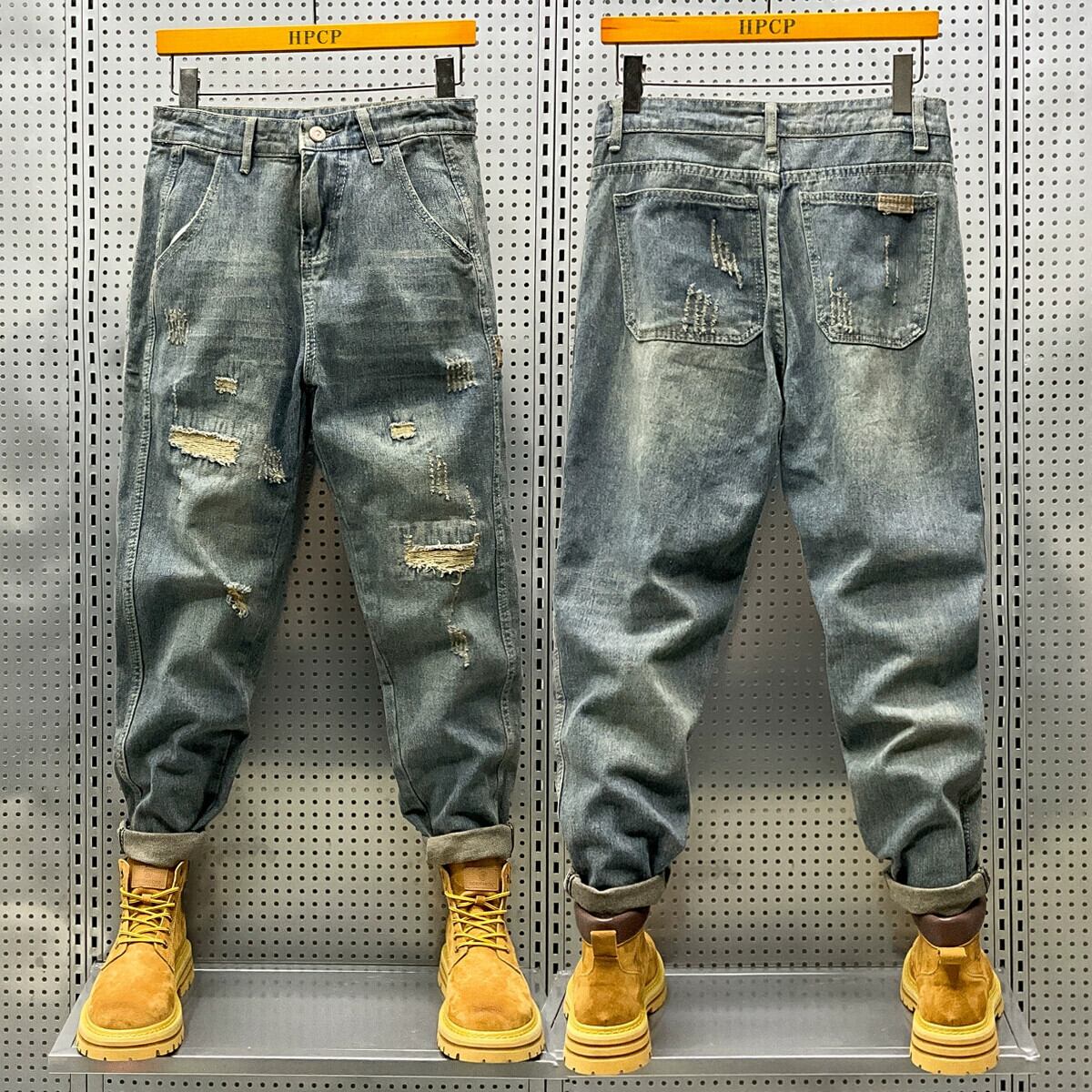 HPCP レトロオールドリップドジーンズメンズ夏薄いファッションブランドルーズストレート 9 ポイントカジュアルパンツメンズファッション サマー 夏物 338197659112184