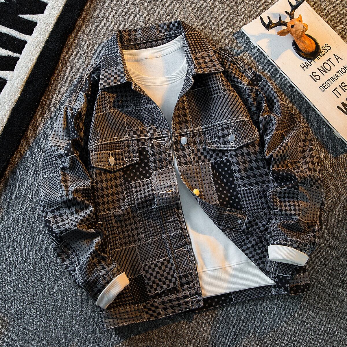 HPCP ese スプライシング千鳥格子コートメンズ春と秋のトレンディなブランドハンサムチェック柄メンズデニムジャケットカジュアルトップ スプリング 春物 オータム 秋物 338196883748376