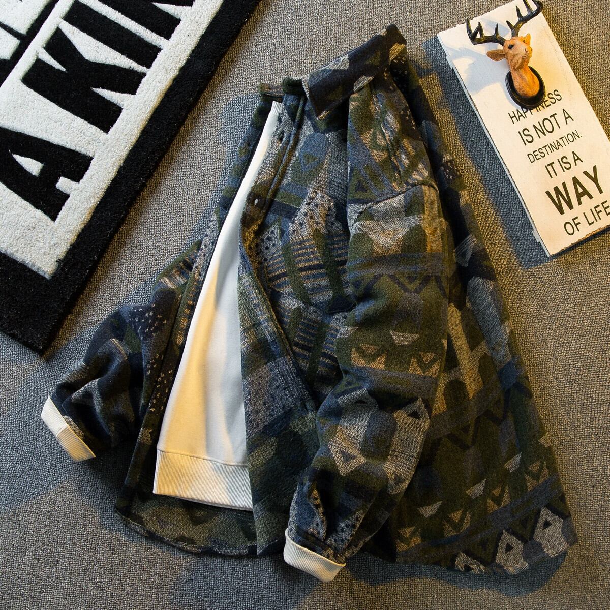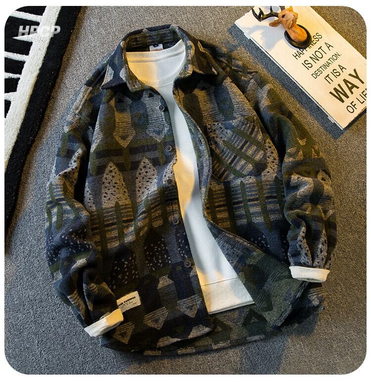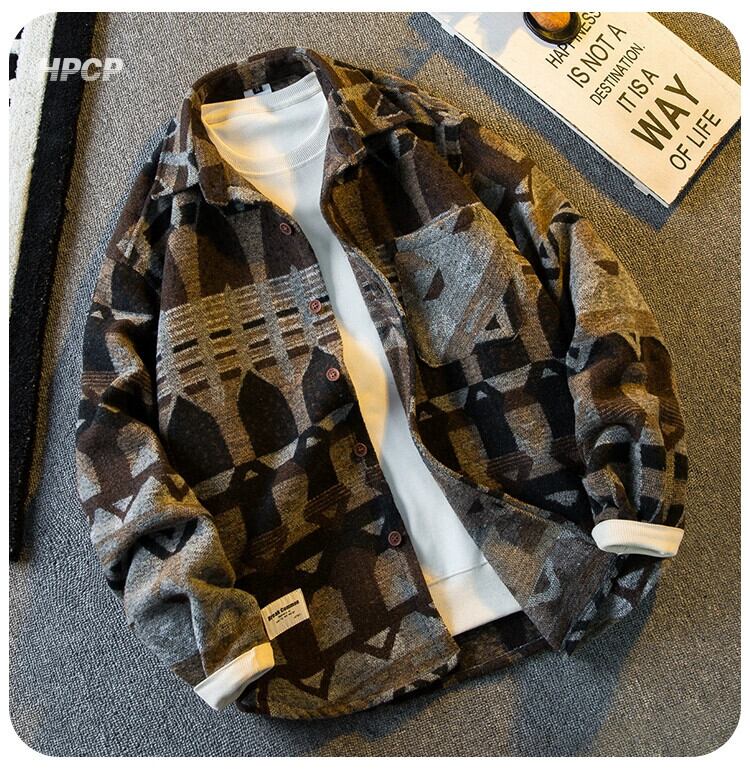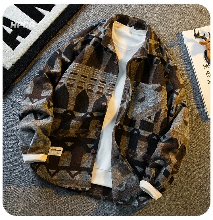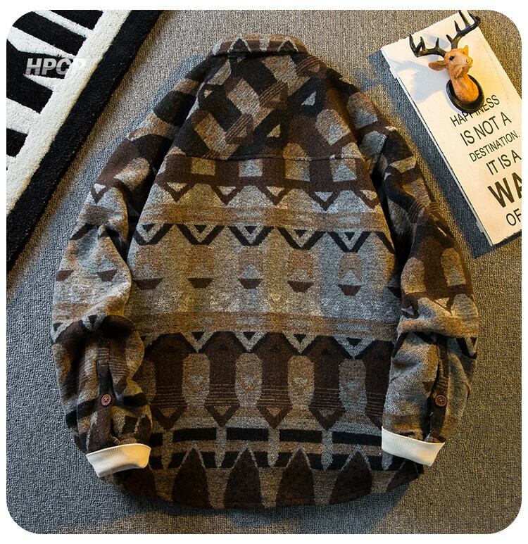 Hengpai トレンディな ese レトロ起毛ジャカード シャツ メンズ長袖春と秋の高級ウール エスニック スタイル ジャケット ロング スプリング 春物 オータム 秋物 3381965501043308
