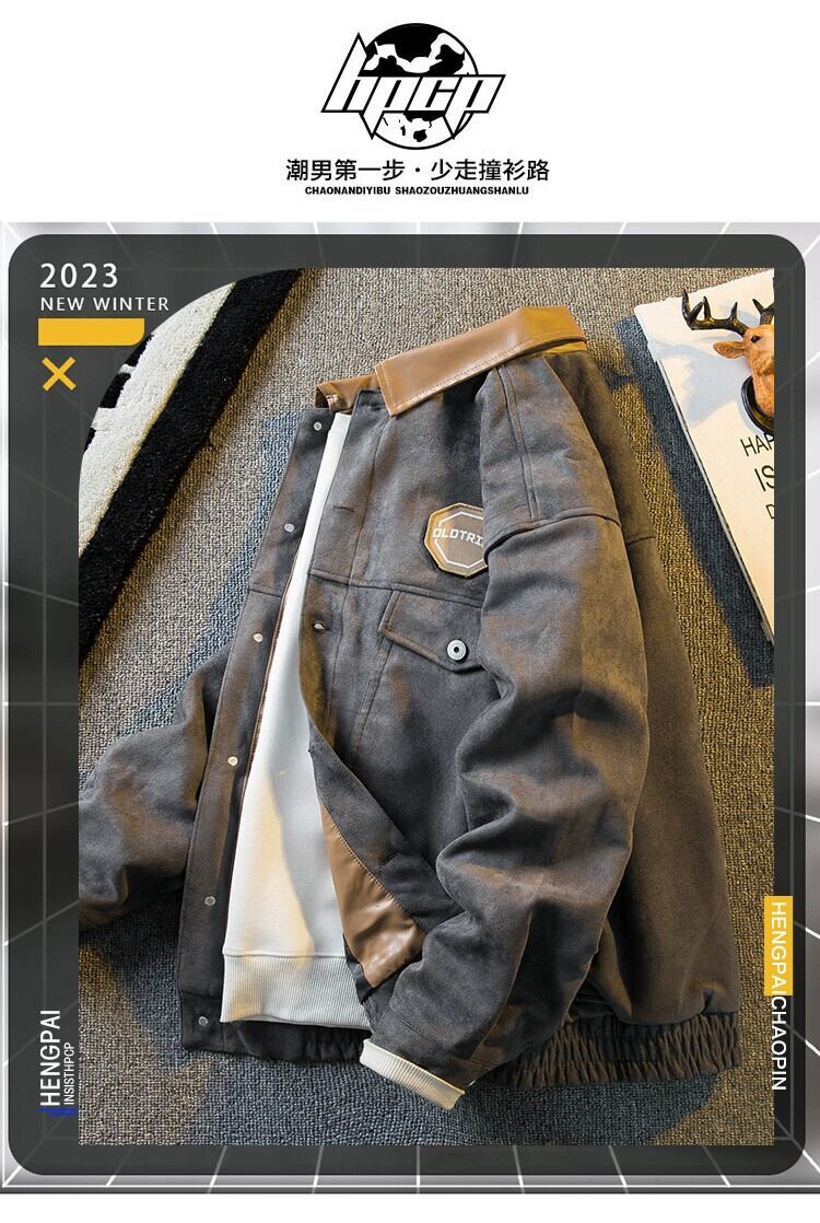 Hengpai トレンディなレトロなワークウェア革襟スプライシングスエードジャケットメンズ春と秋のハンサムなアメリカのボンバージャケット スウェード スプリング 春物 オータム 秋物 レザー 3381958181551800