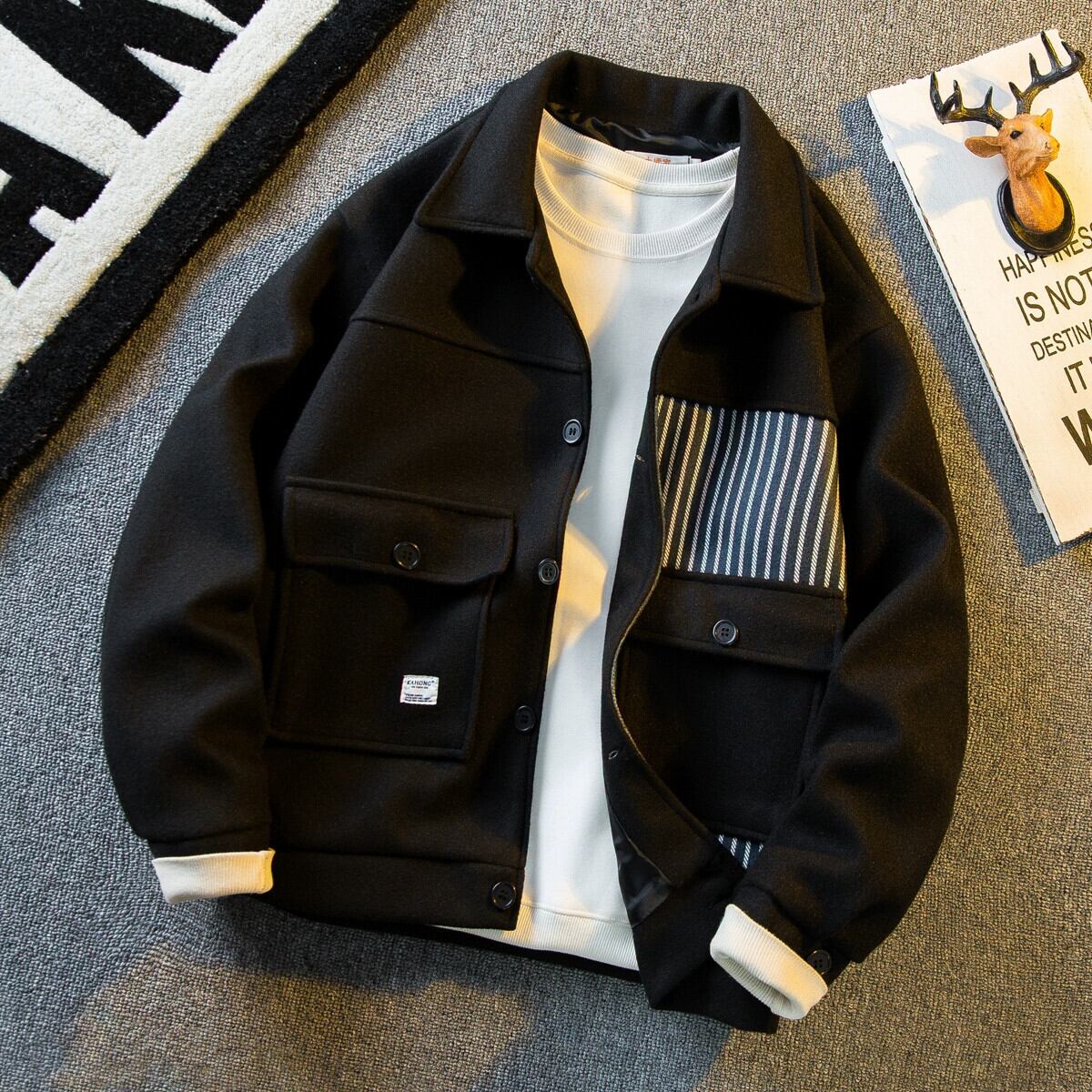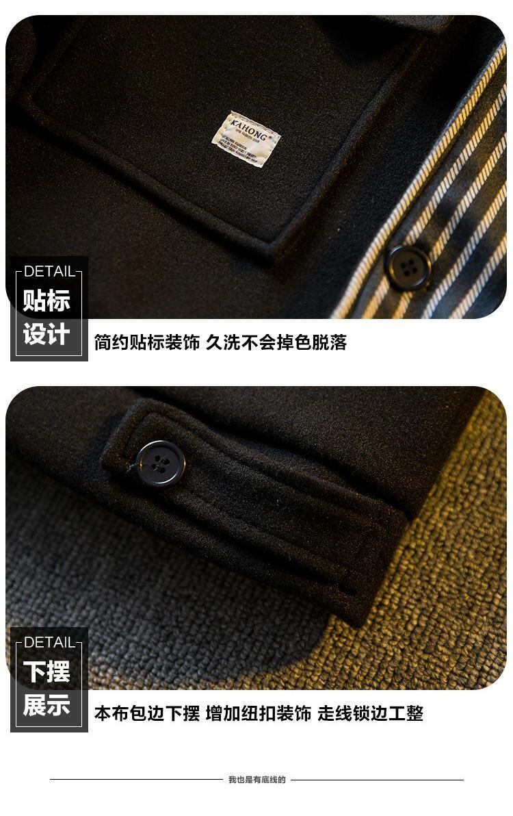 Hengpai トレンディな黒の小さな香りのよいストライプスプライシングウールジャケットメンズ春と秋のハンサムなメンズラペルシャツジャケット ブラック スプリング 春物 オータム 秋物 3381960104241893
