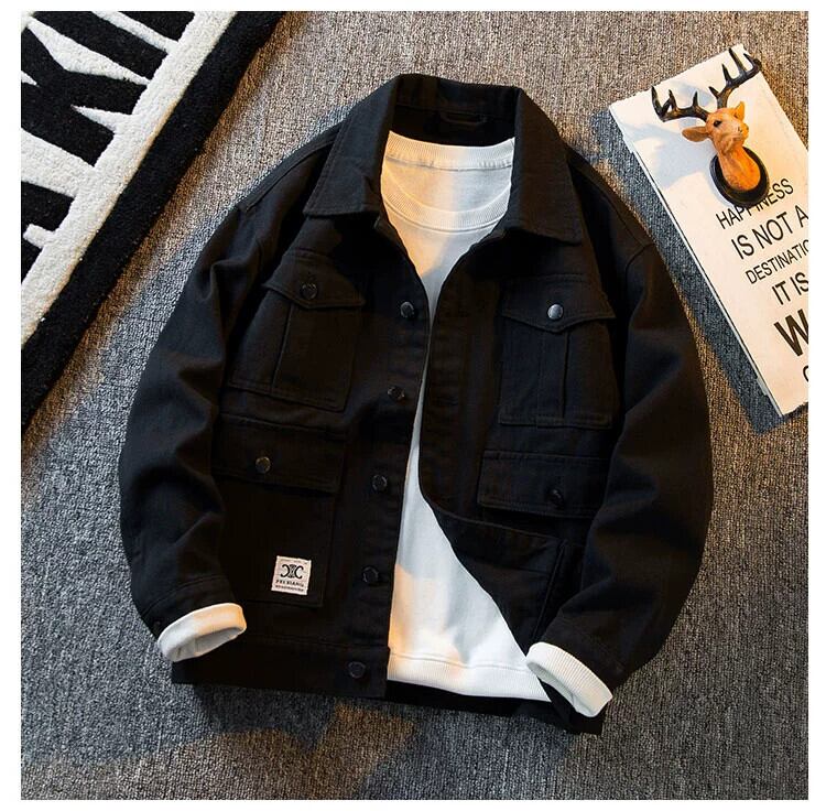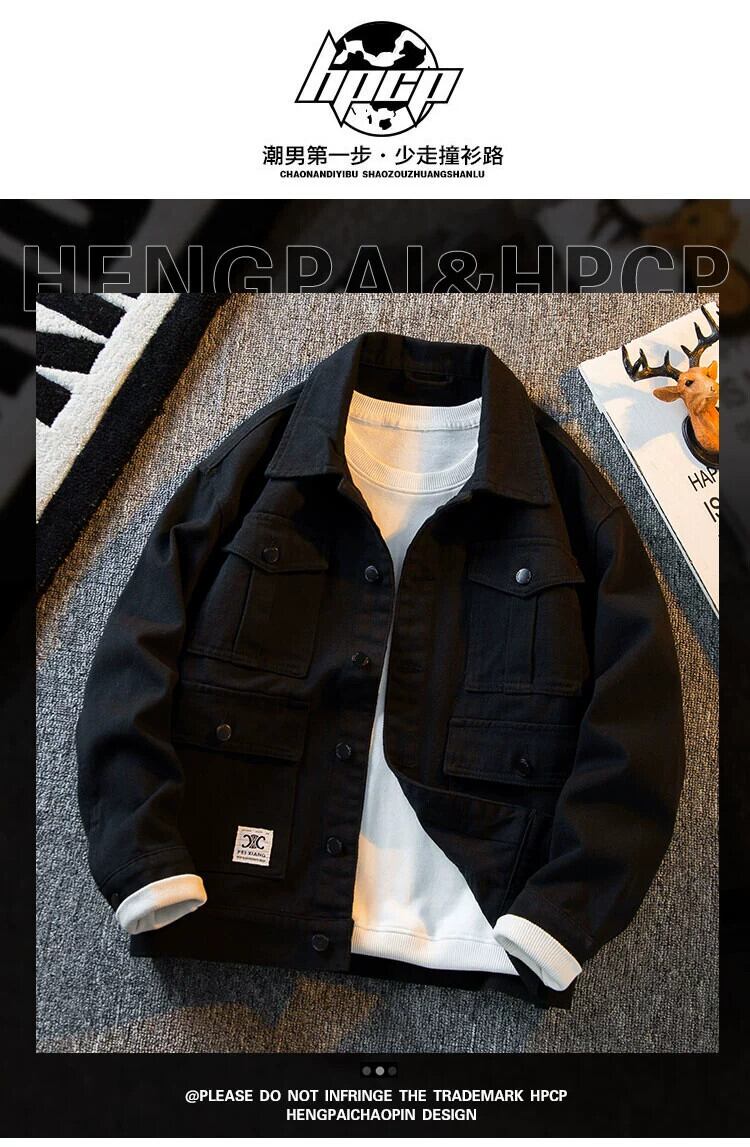 HPCP 黒マルチポケットワークジャケットメンズ春秋トレンディブランドハンサムハイエンドメンズカジュアルデニムジャケット ブラック スプリング 春物 オータム 秋物 ポケット多め 3381966824442046