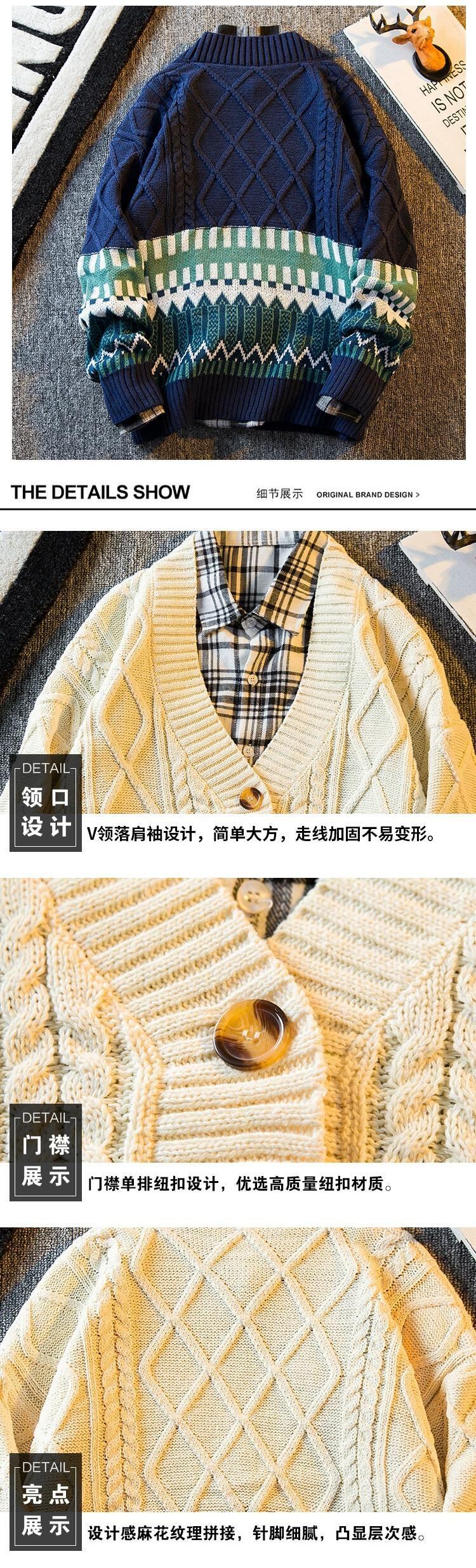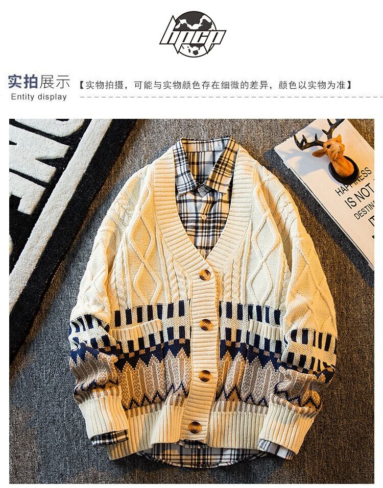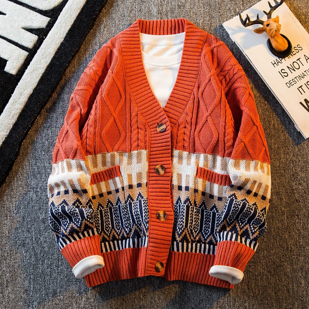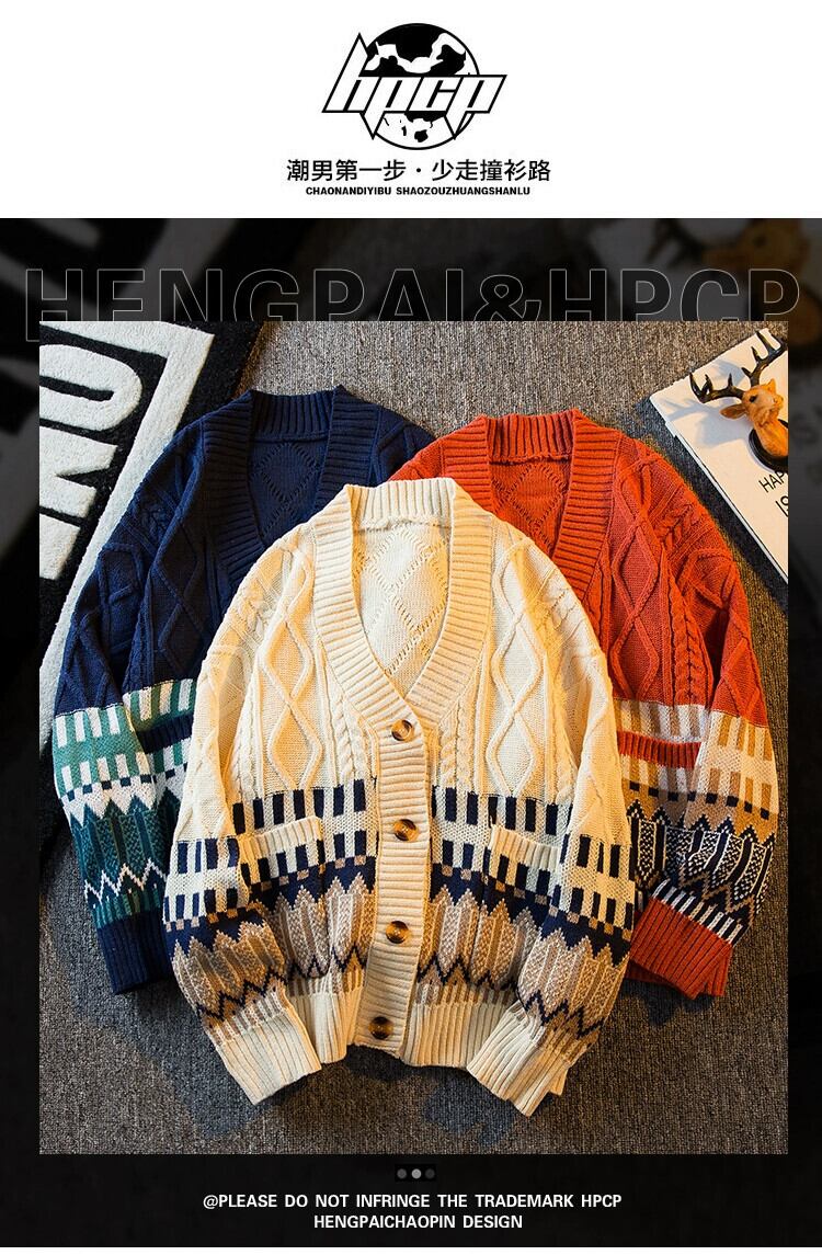 Hengpai トレンディな V ネックステッチエスニックスタイルカップルカーディガンセーターメンズ冬レトロ怠惰なスタイルニットセータージャケット ウィンター 冬物 Vネック 3381945472972560