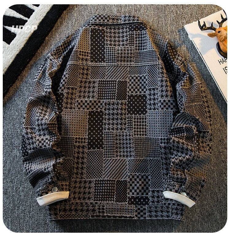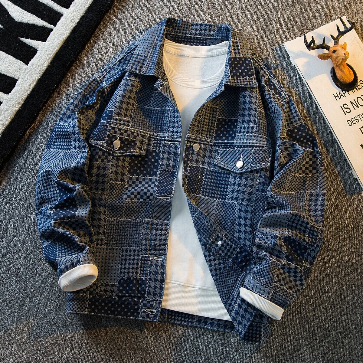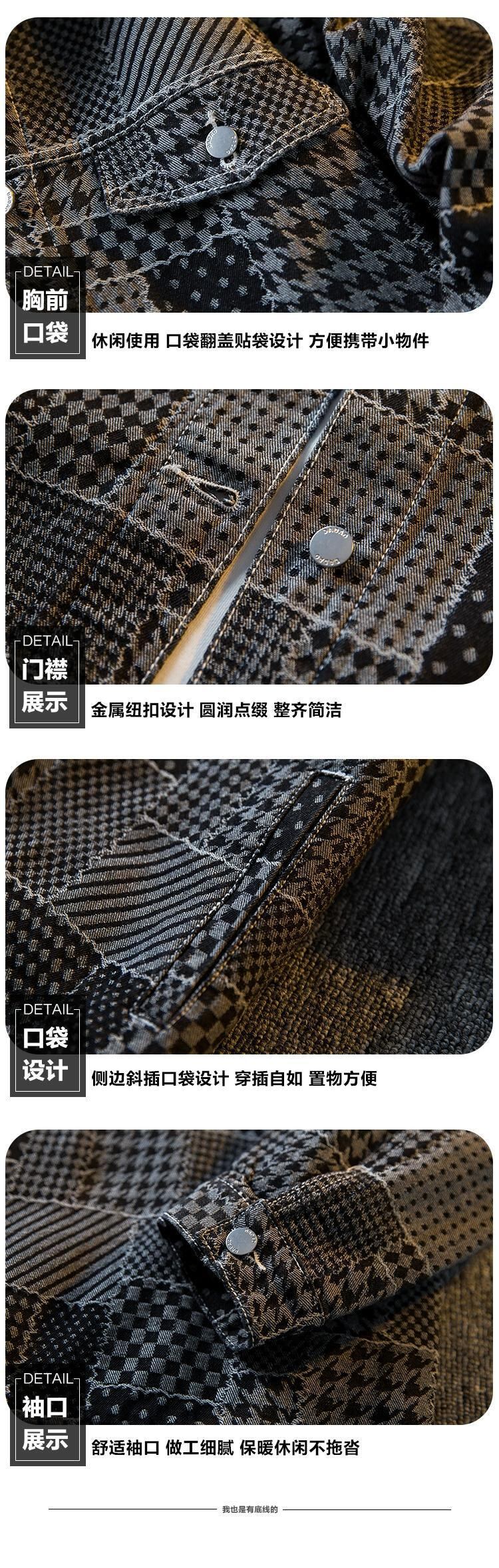 水平ファッションレトロ市松模様ジャカードスプライシングデニムジャケットメンズハイエンドハンサム千鳥格子カジュアルジャケット 3381916431009471