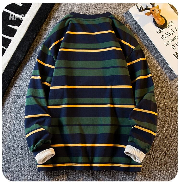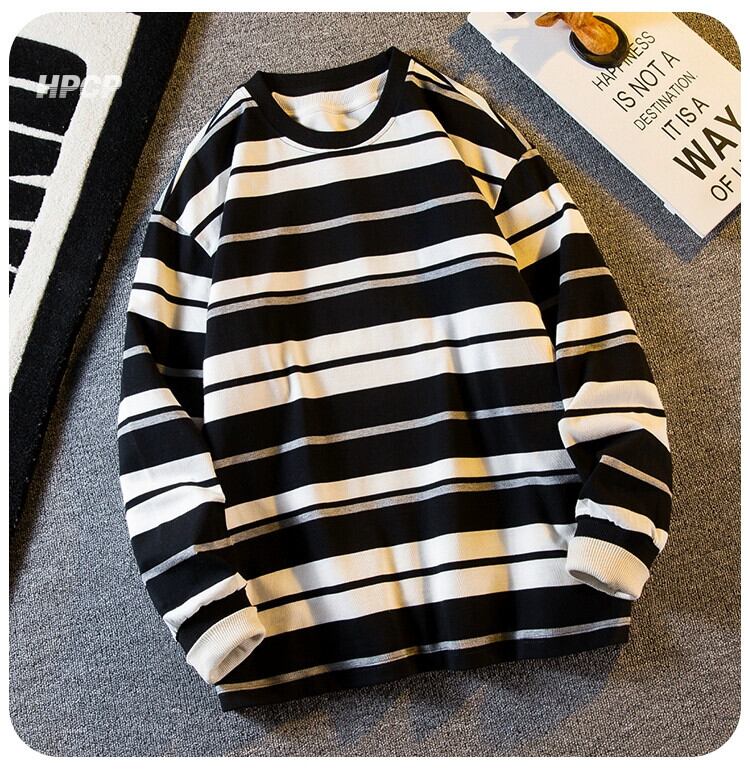 横型トレンディアメリカンスタイルヘビーウェイトレトロストライプスウェットシャツメンズ春秋トレンディブランドルーズコットンオフショルダー長袖Tシャツ ロング スプリング 春物 オータム 秋物 3381937983565636