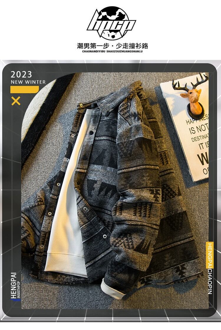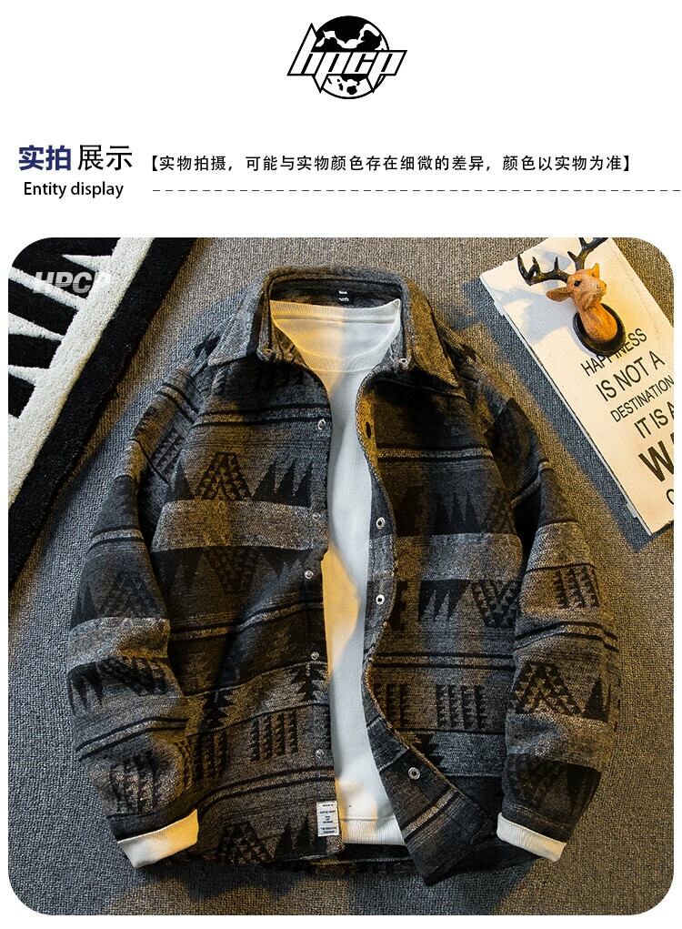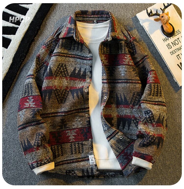 Hengpai トレンディなレトロなエスニックスタイルの起毛シャツメンズ長袖春と秋のフランネルウールシャツジャケット ロング スプリング 春物 オータム 秋物 3381927479781354