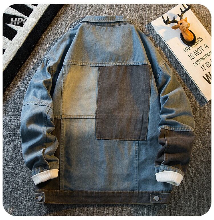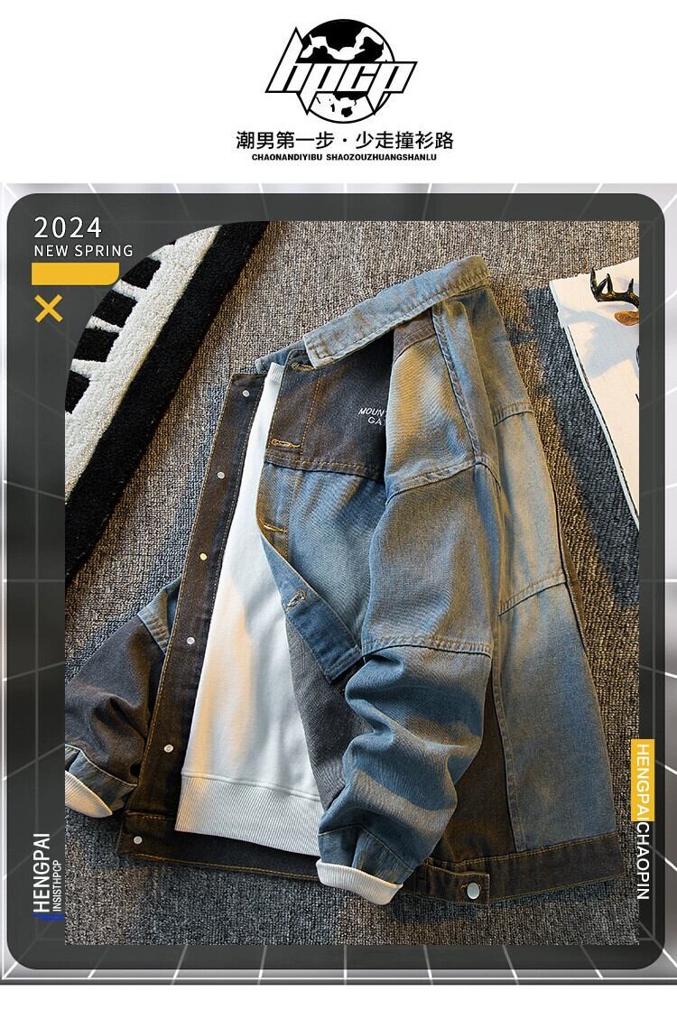 Hengpai トレンディな春の新レトロなダメージ加工スプライシング デニム ジャケット メンズ ウォッシュ ルーズ カジュアル ラペル ジャケット スプリング 春物 3381997285101032