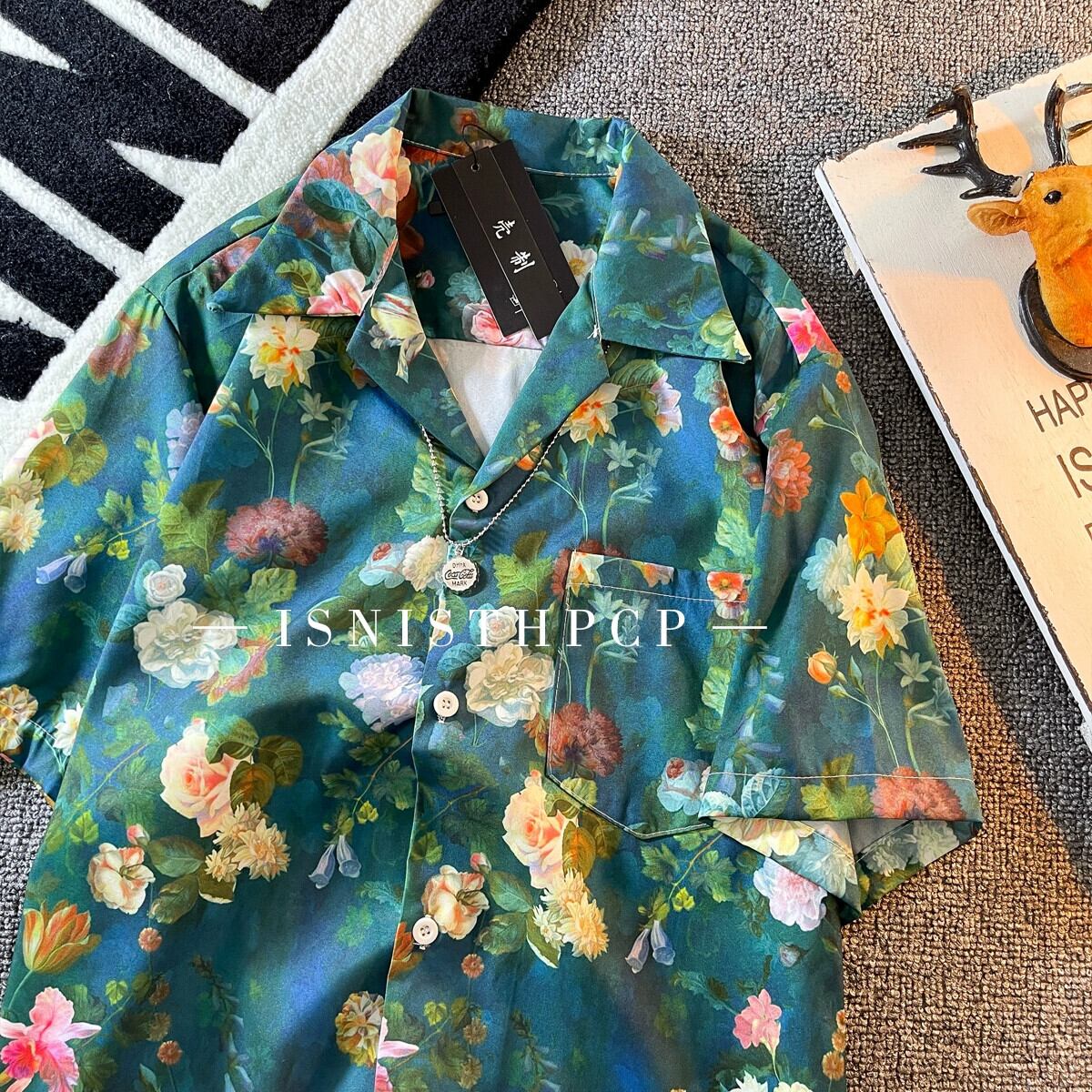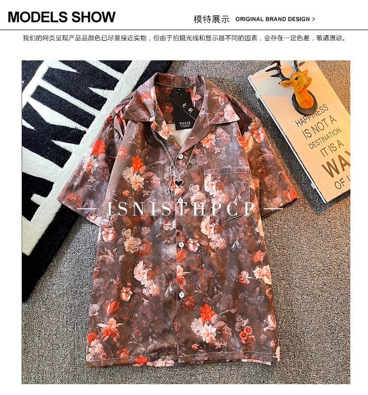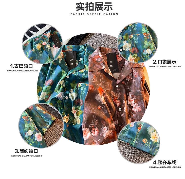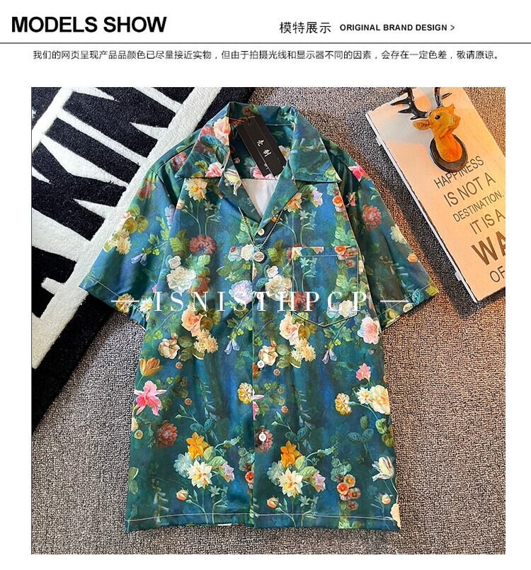 ヴィンテージレトロ油絵フラワーシャツメンズ半袖夏アイスシルクルーズ薄手服ハンサムキューバカラーシャツF サマー 夏物 フラワーデザイン ビンテージ 3381992108588314