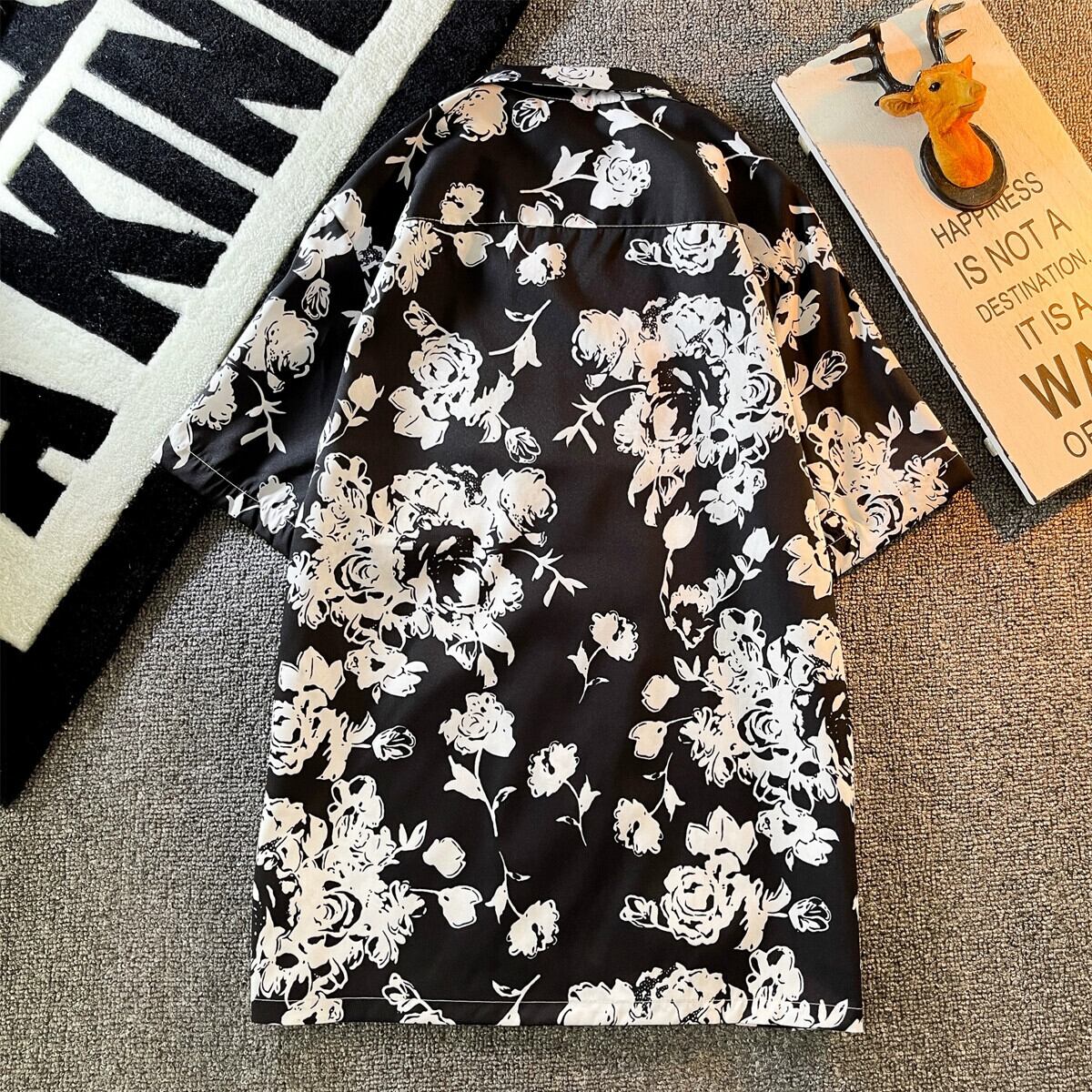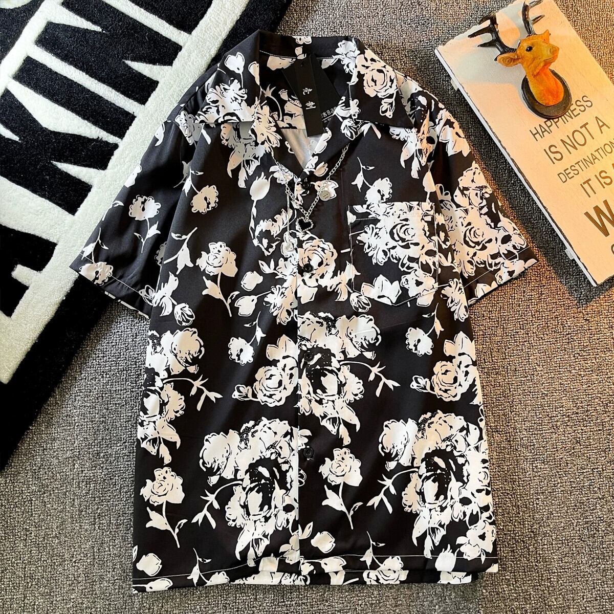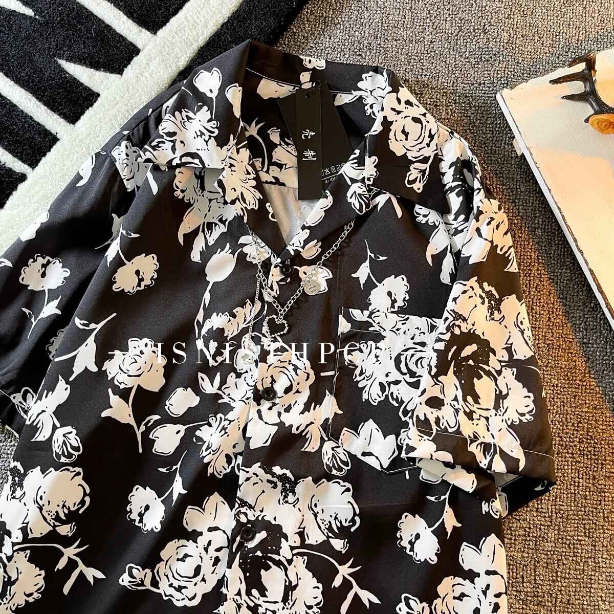 黒花柄シャツメンズ半袖インハンサムファッションブランド夏のアイスシルク服ルーズカジュアルプリントシャツ半袖Y ブラック サマー 夏物 3381960477393598