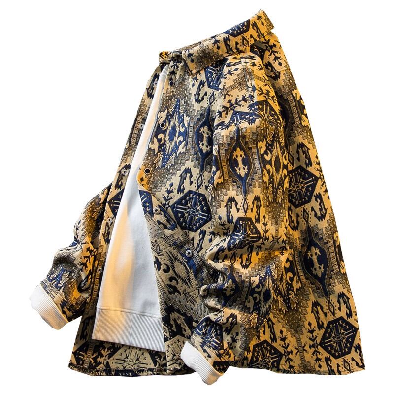 HPCP エスニックスタイルのレトロな織りと刺繍のゴールドハイエンドシャツメンズ長袖ハイエンドハンサムトレンディチェック柄シャツメンズ ロング レッド 3381970009575522