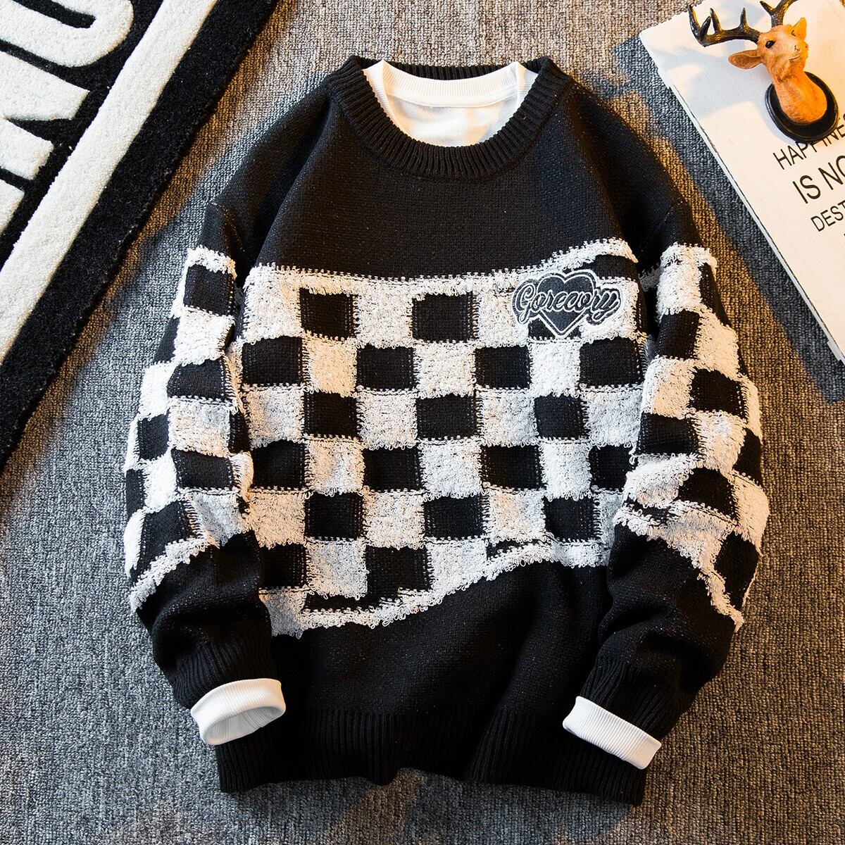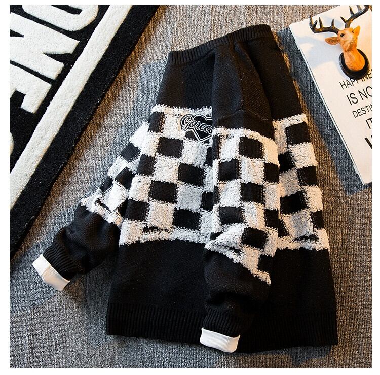 HPCP アメリカのハイストリートインチェッカーボードセーターメンズ冬怠惰なハイエンドトレンディブランド厚みのあるラウンドネックセーター ウィンター 冬物 Oネック 3381926414590605