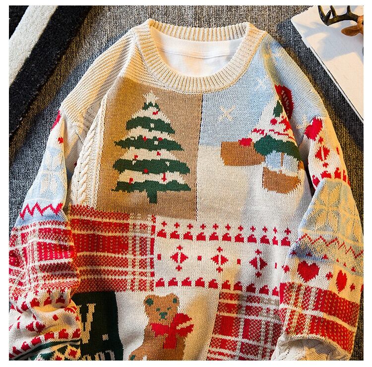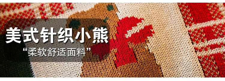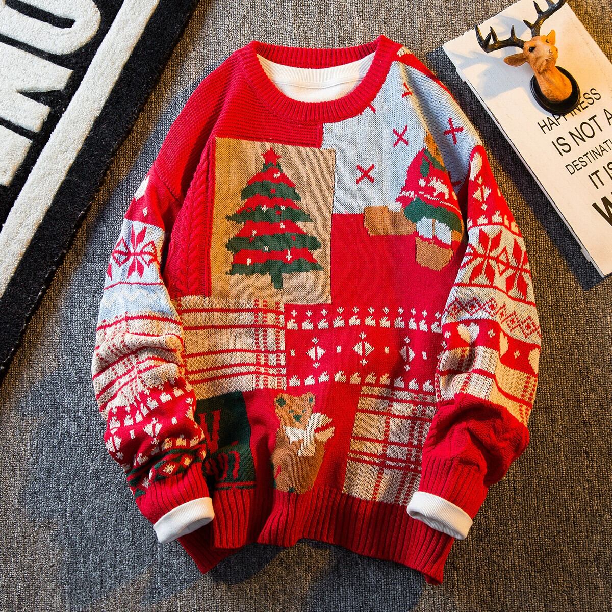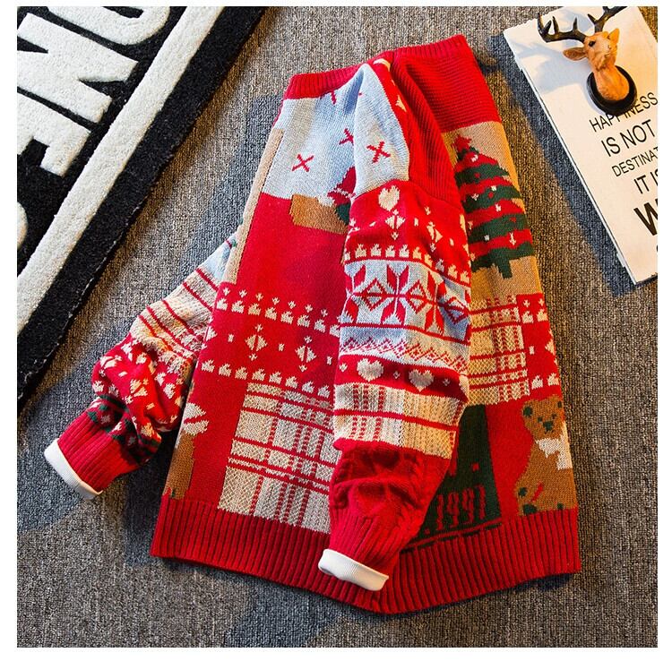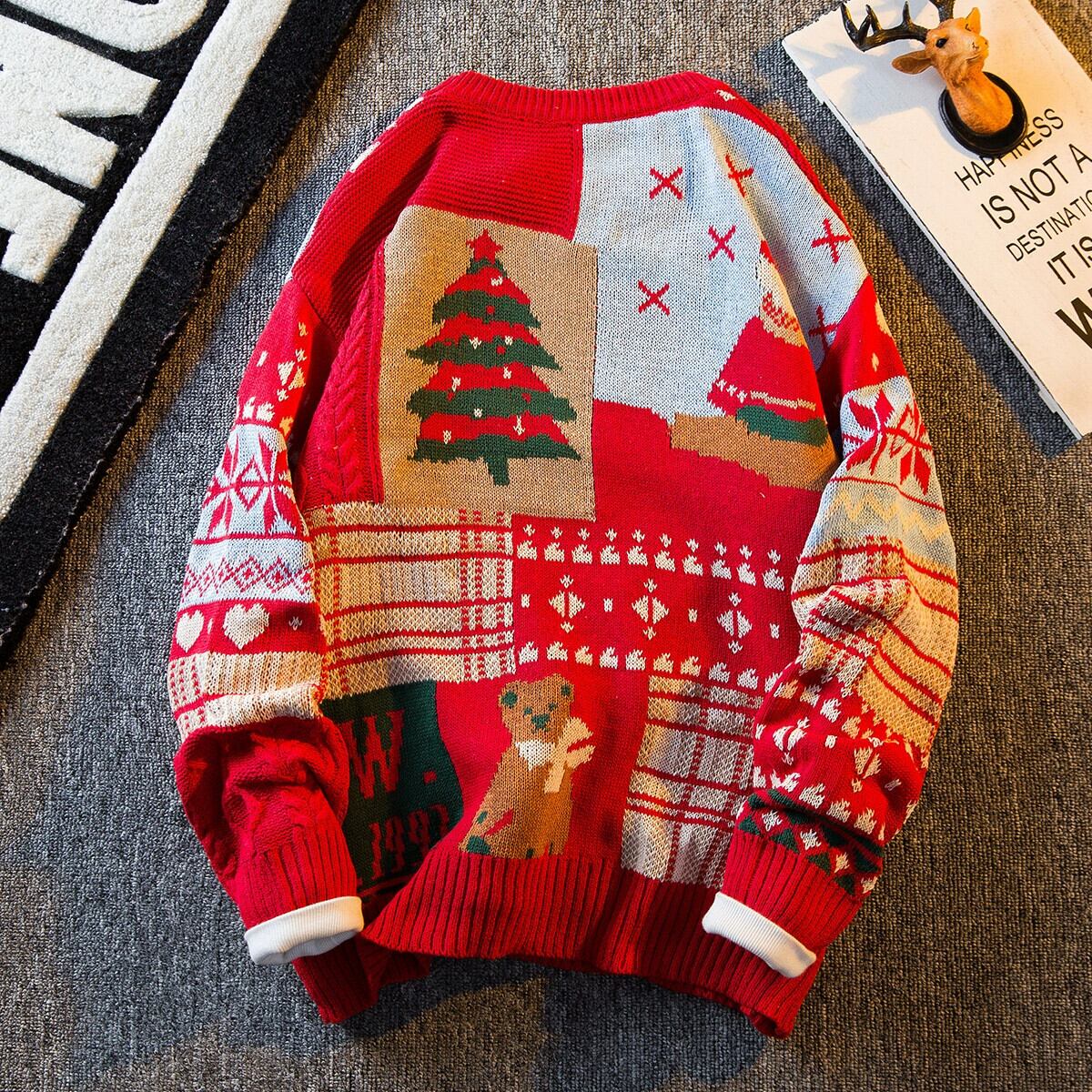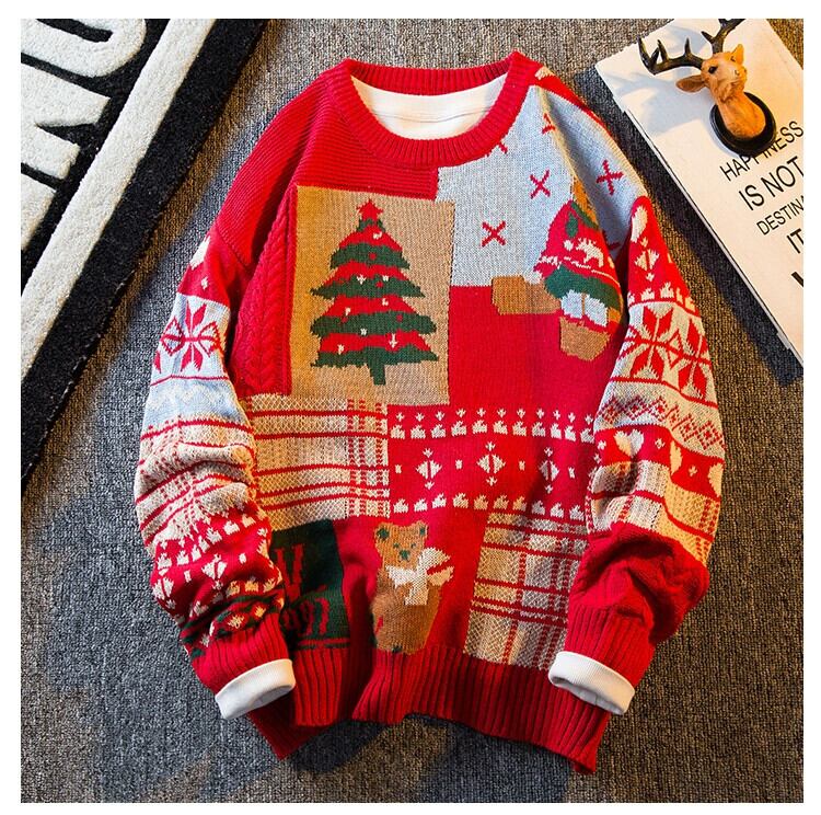 HPCP クリスマス雰囲気クマ赤いセーターメンズレトロ怠惰なハイエンドカップルラウンドネックルーズセーター レッド Oネック 338192210488287