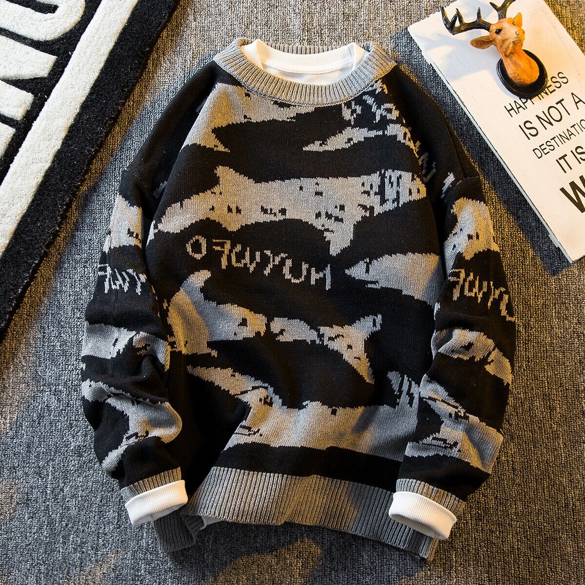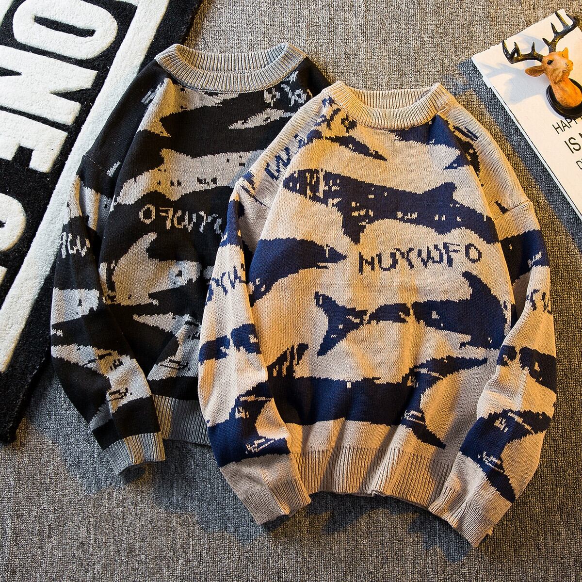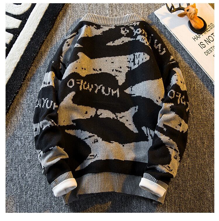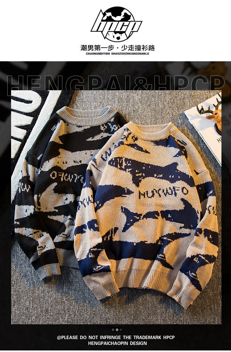 HPCP 冬オールプリントサメセーターメンズルーズ秋冬パーソナライズトレンディブランドレトロラウンドネックプルオーバーセータージャケット オータム 秋物 ウィンター 冬物 Oネック 3381972907114476