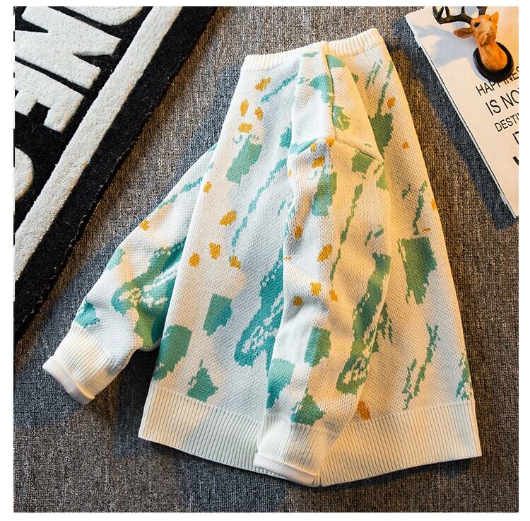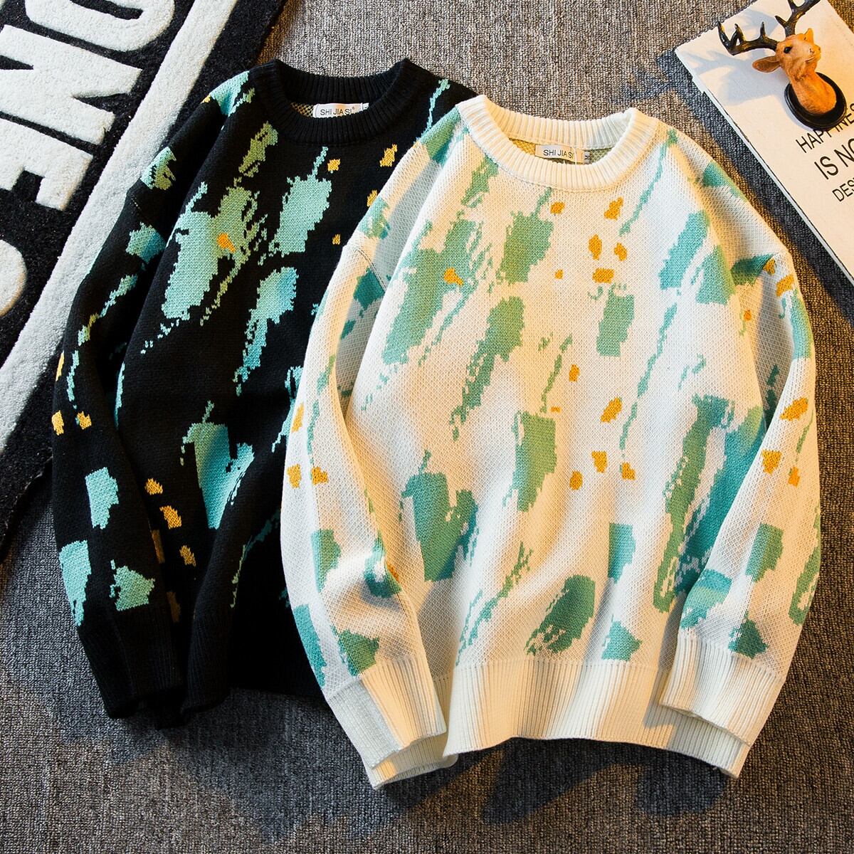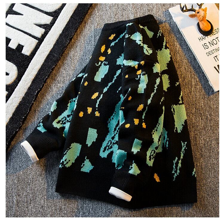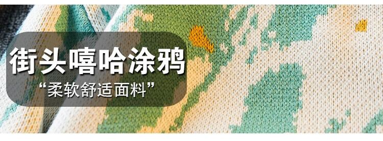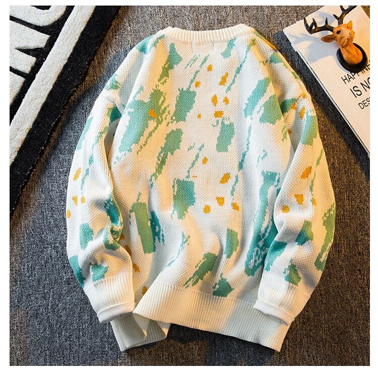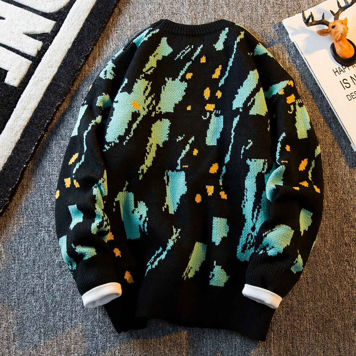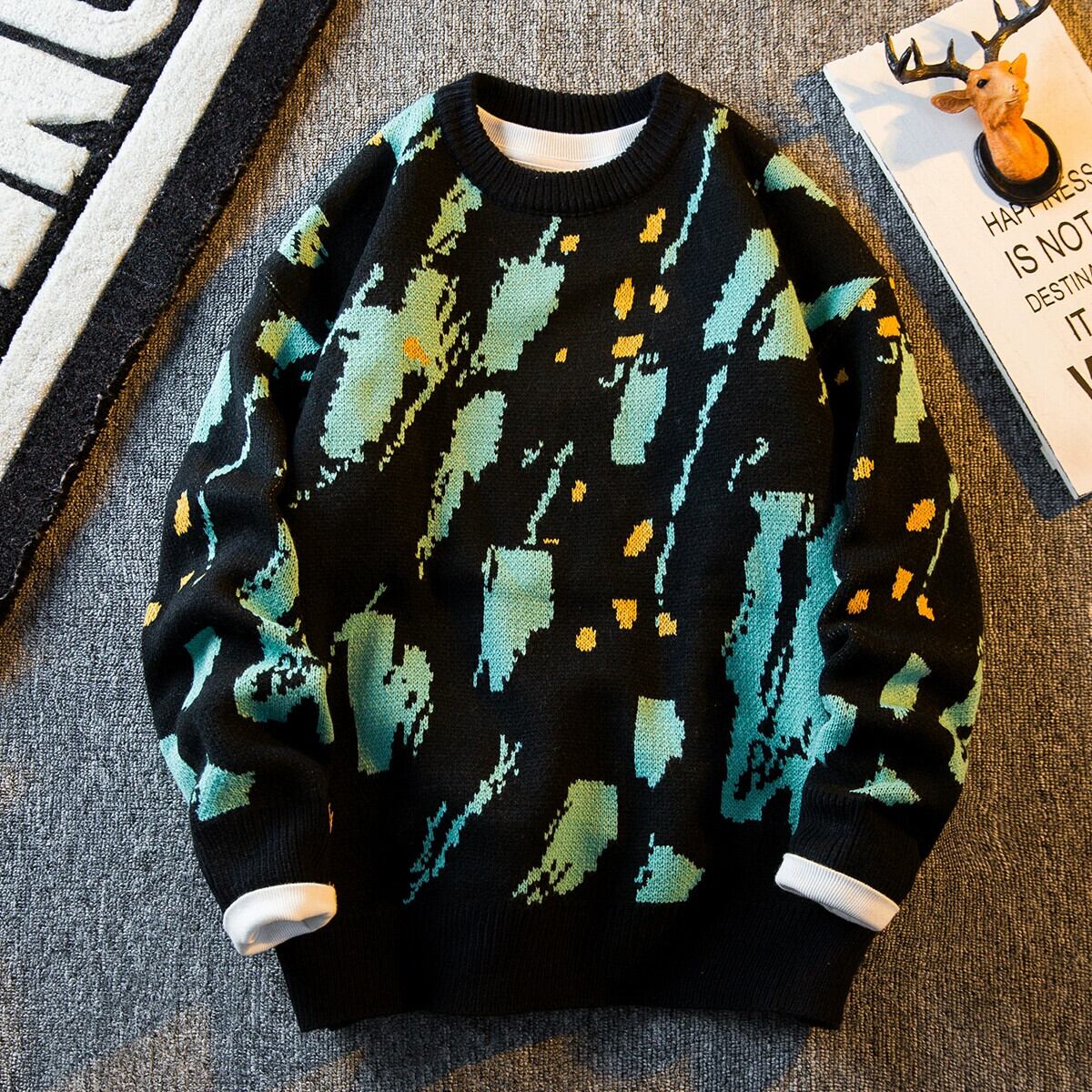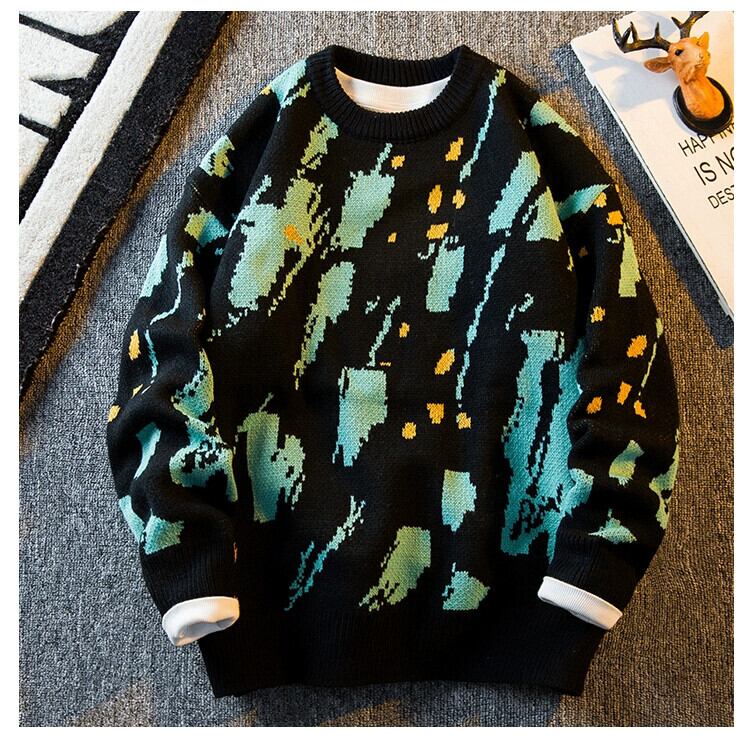 HPCP 落書きインクラウンドネックセーターメンズ冬暖かい肥厚セーターレトロカジュアルカップルニットジャケット ウィンター 冬物 Oネック 3381945994915796