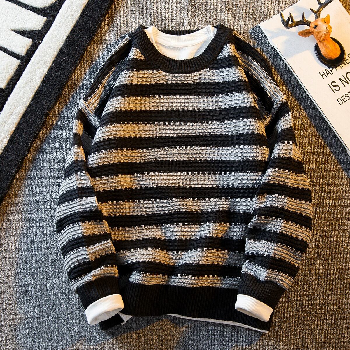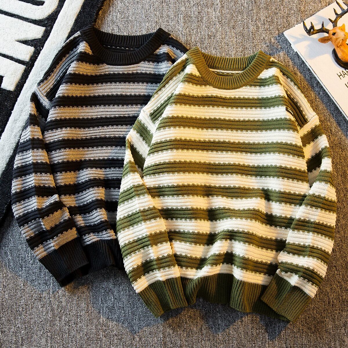 HPCP 怠惰なスタイルのレトロなストライプのラウンドネックセーターメンズ冬ハンサムトレンディブランドハイエンドカップル BF スタイルセーター ウィンター 冬物 Oネック 3381991131410022