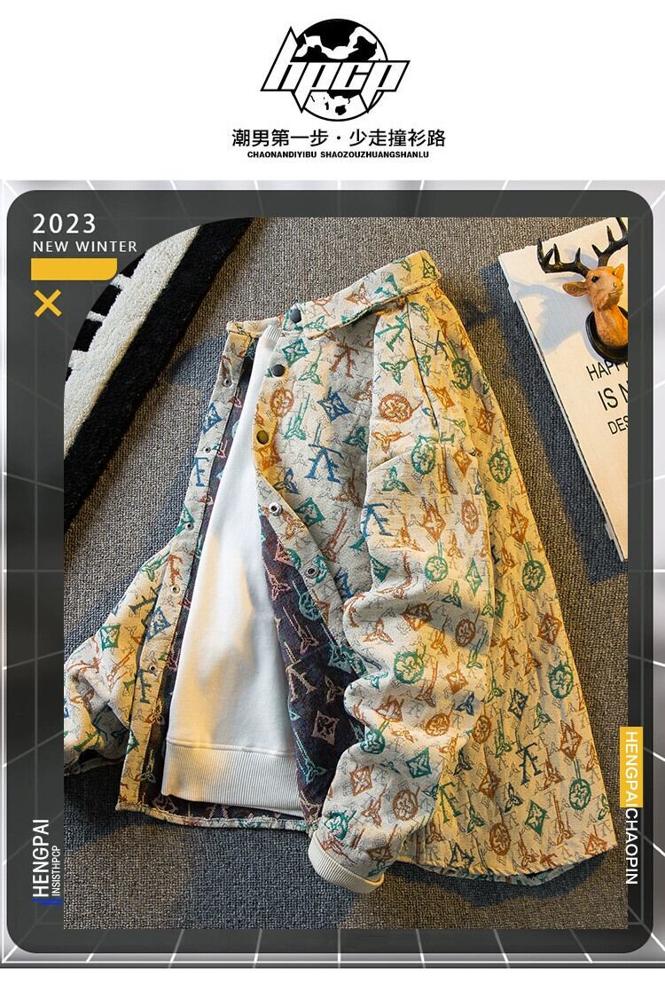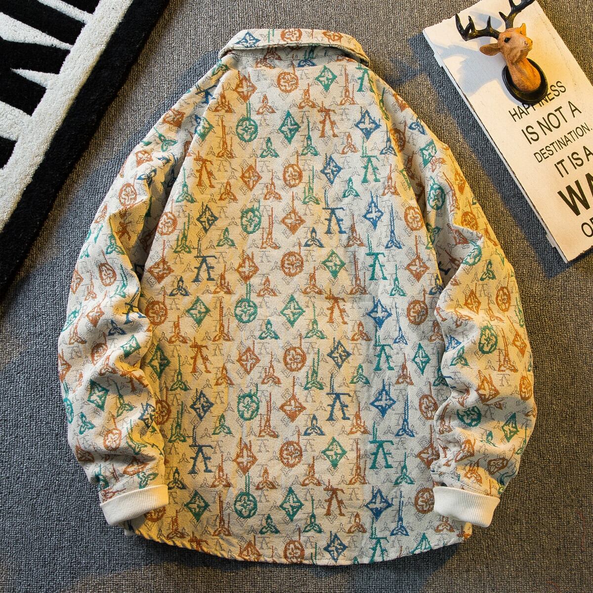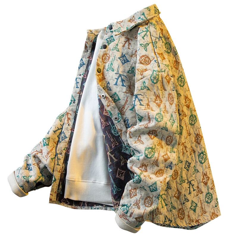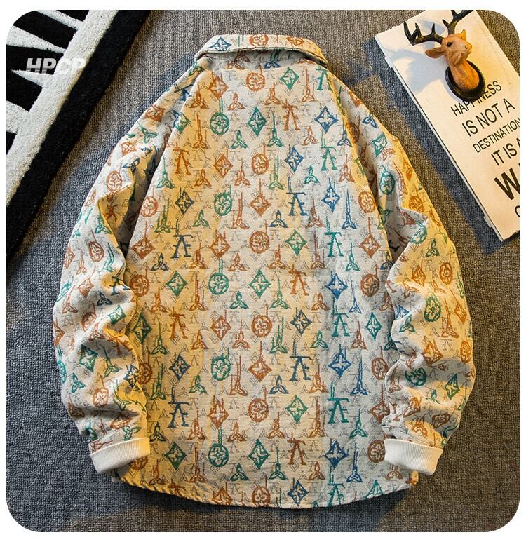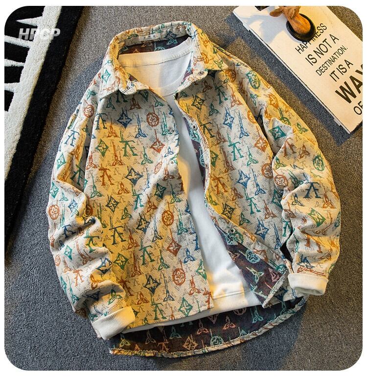 春と秋のスタイルの水平トレンディなヴィンテージ レトロ ジャカード オールオーバー プリント長袖シャツ メンズ インターネット セレブ ラペル シャツ ジャケット ロング スプリング 春物 オータム 秋物 ビンテージ 3381962237860088