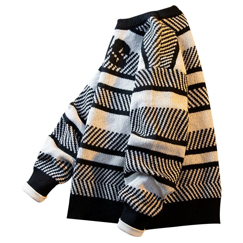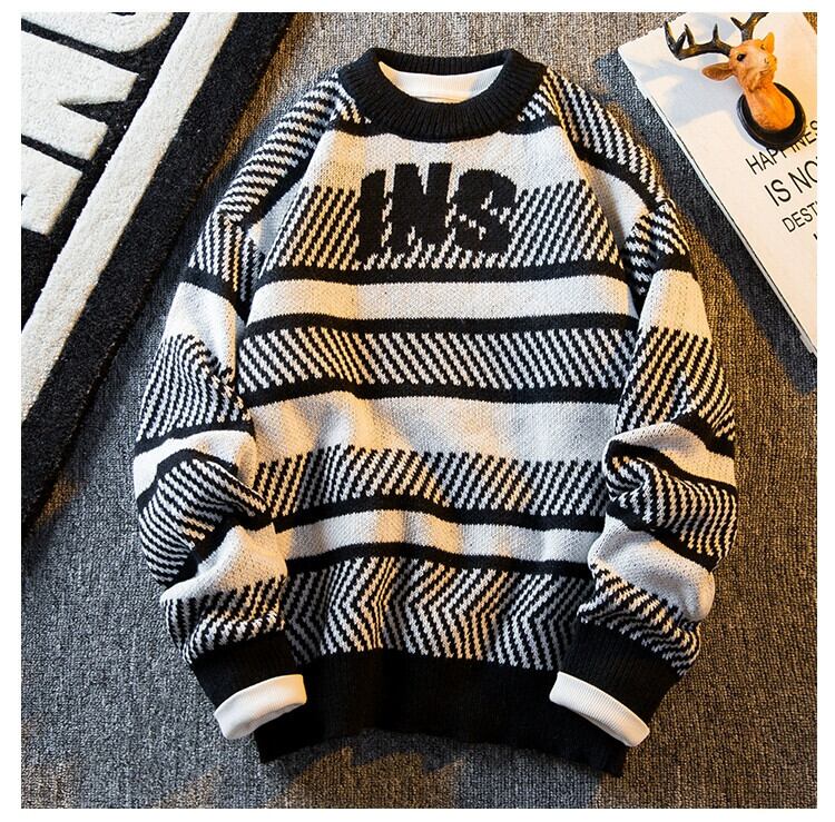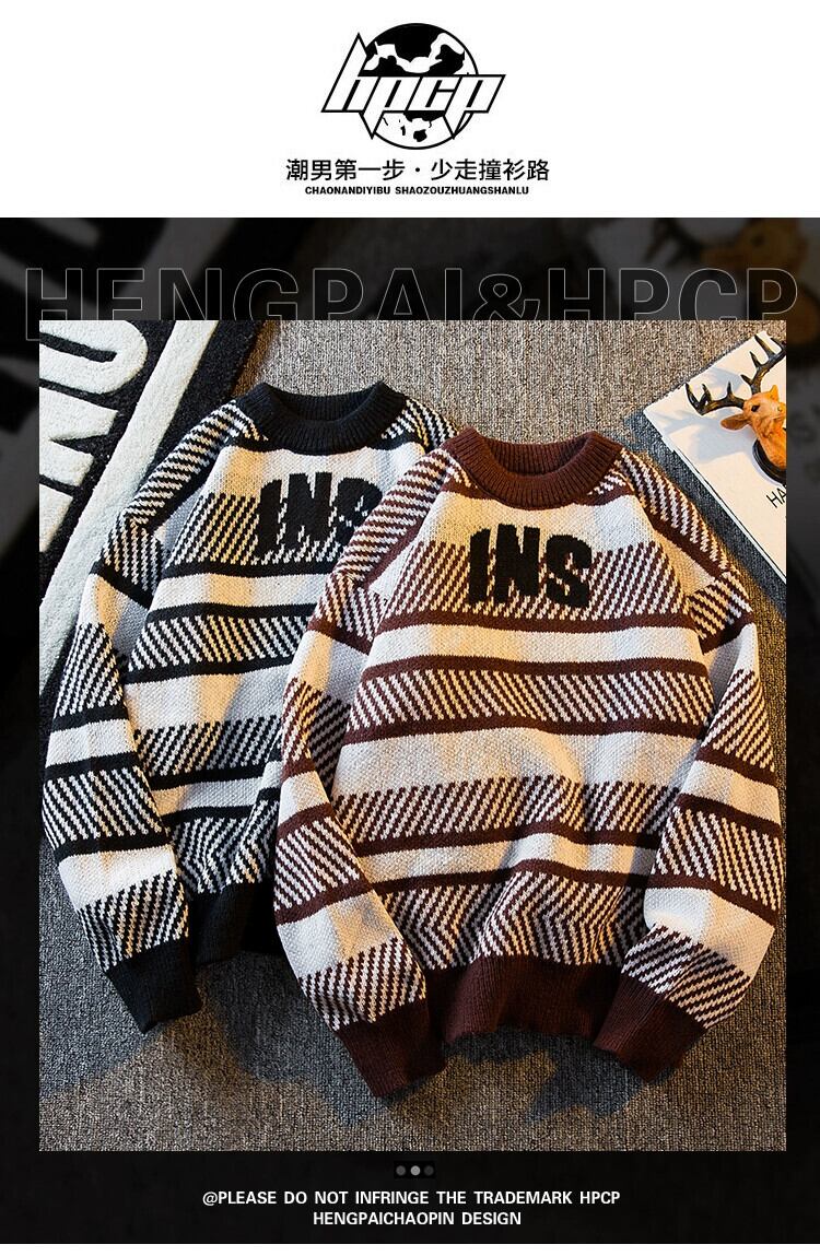 HPCP 全国トレンディなストライプステッチコントラストセーターメンズハイストリートインファッションブランドハイエンドセンスハンサムラウンドネックセーター男性 Oネック 3381954718836315