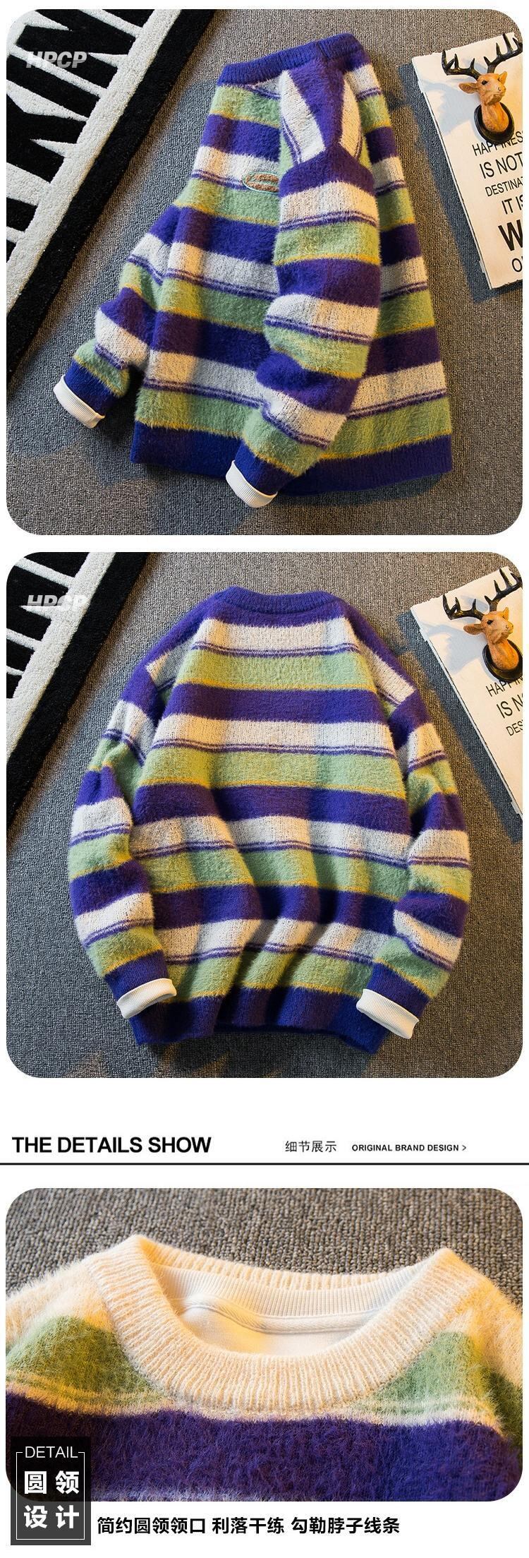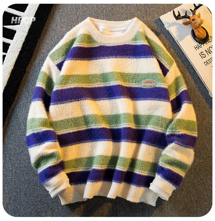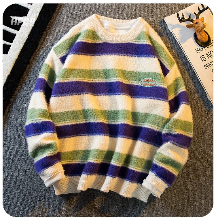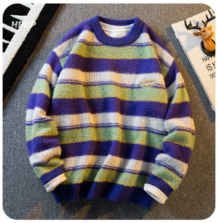 水平トレンディモヘアカラーブロックストライプセーターメンズルーズ秋と冬ラウンドネック怠惰なスタイルのカップルソフトワックスセーター オータム 秋物 ウィンター 冬物 Oネック 3381996718139699