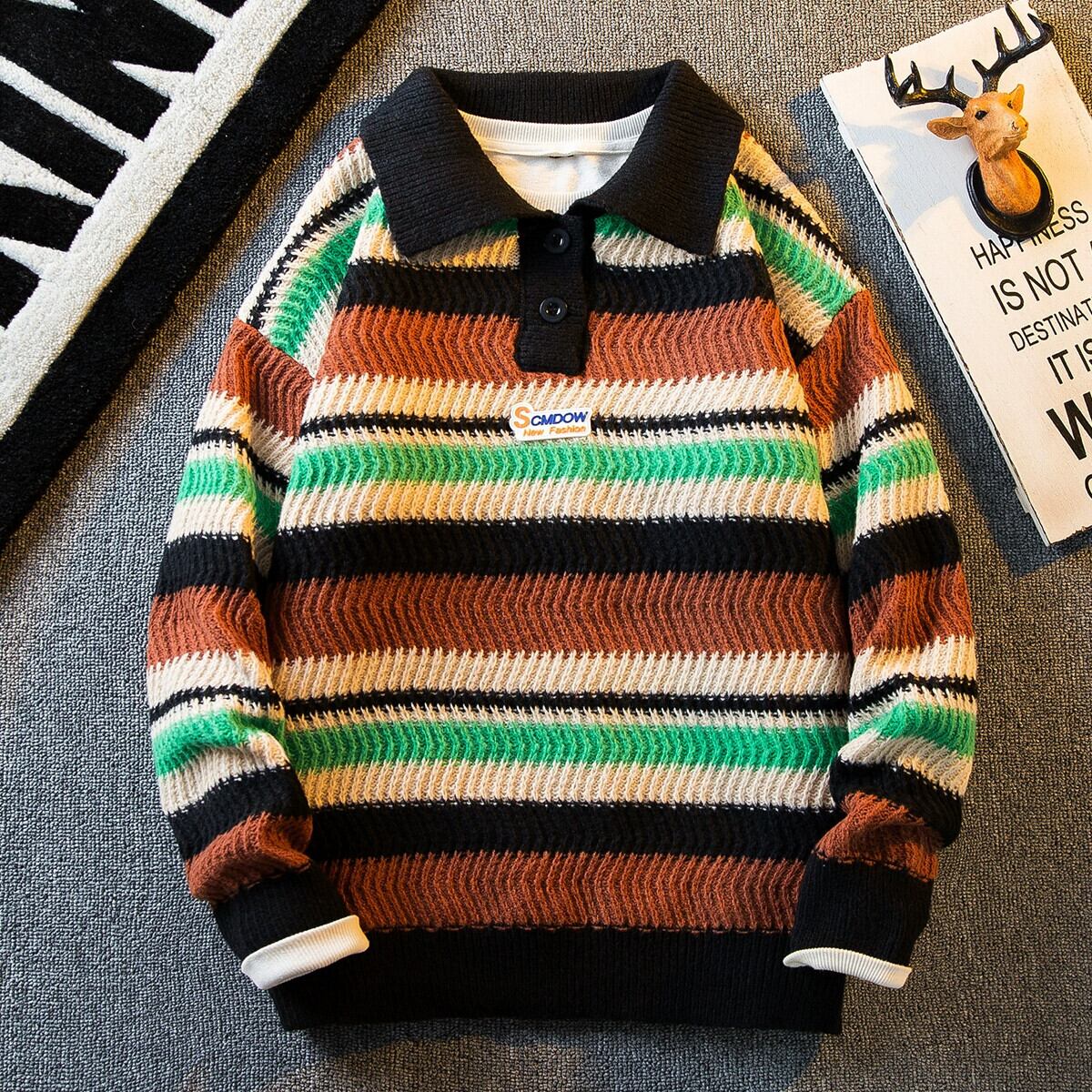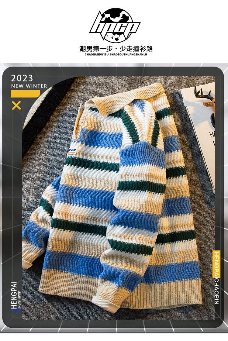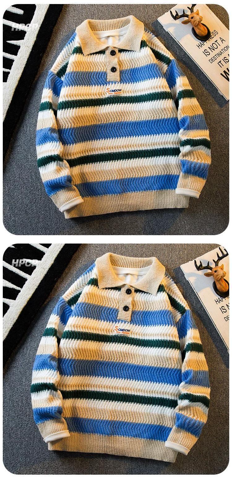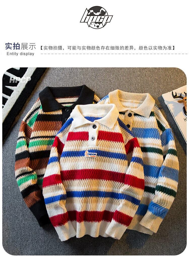 HPCP ese コントラストレインボーストライプポロカラーセーターメンズルーズカレッジスタイルオーバーサイズカップルセーター 338196156580571
