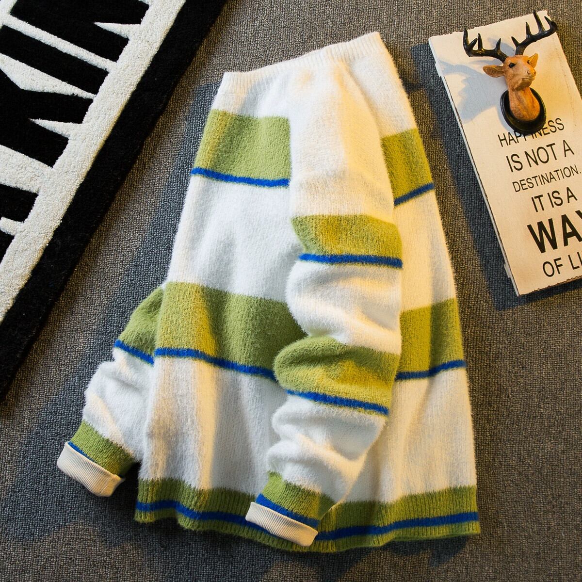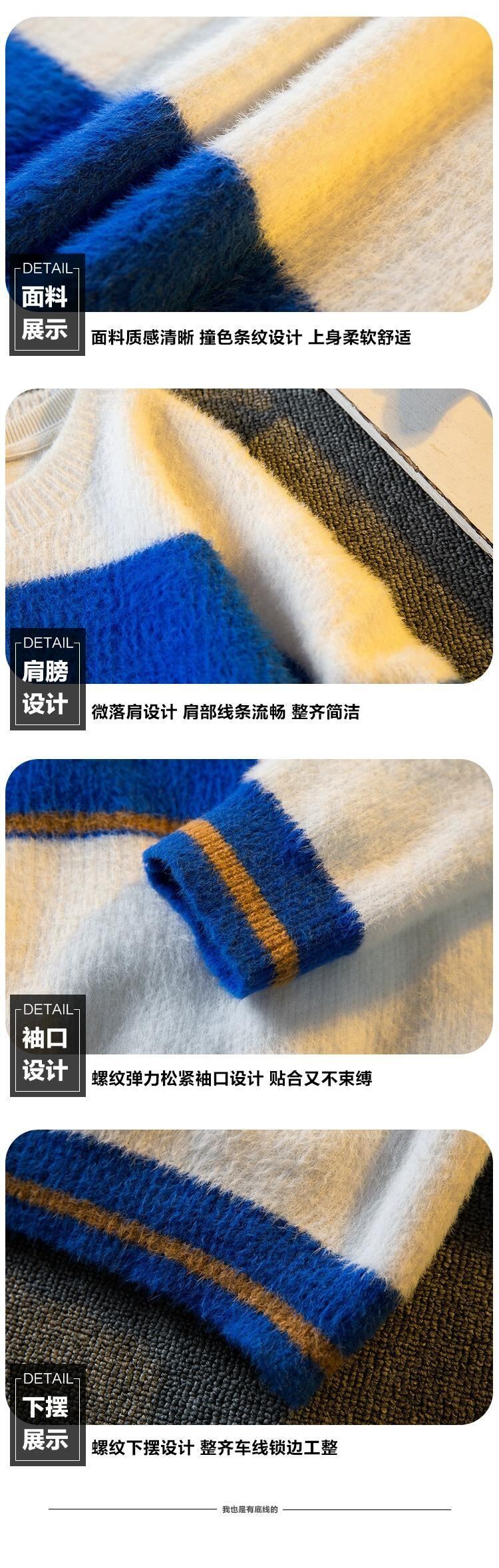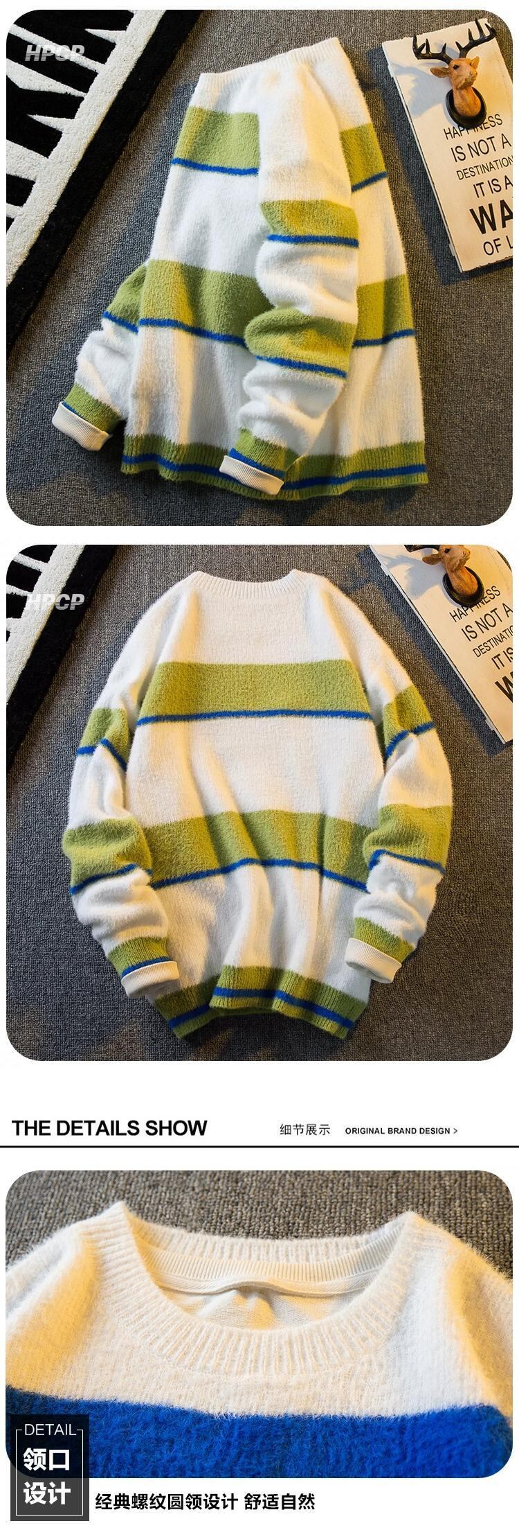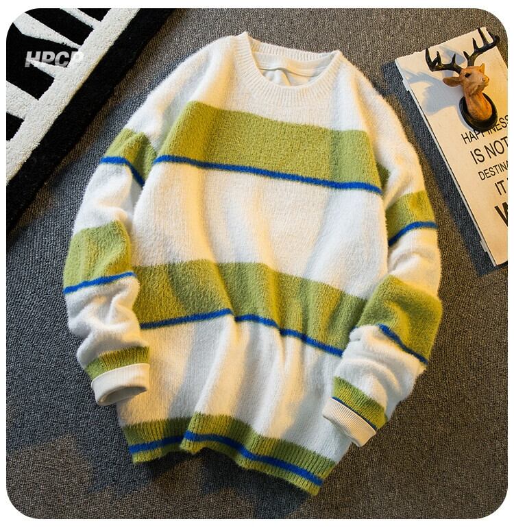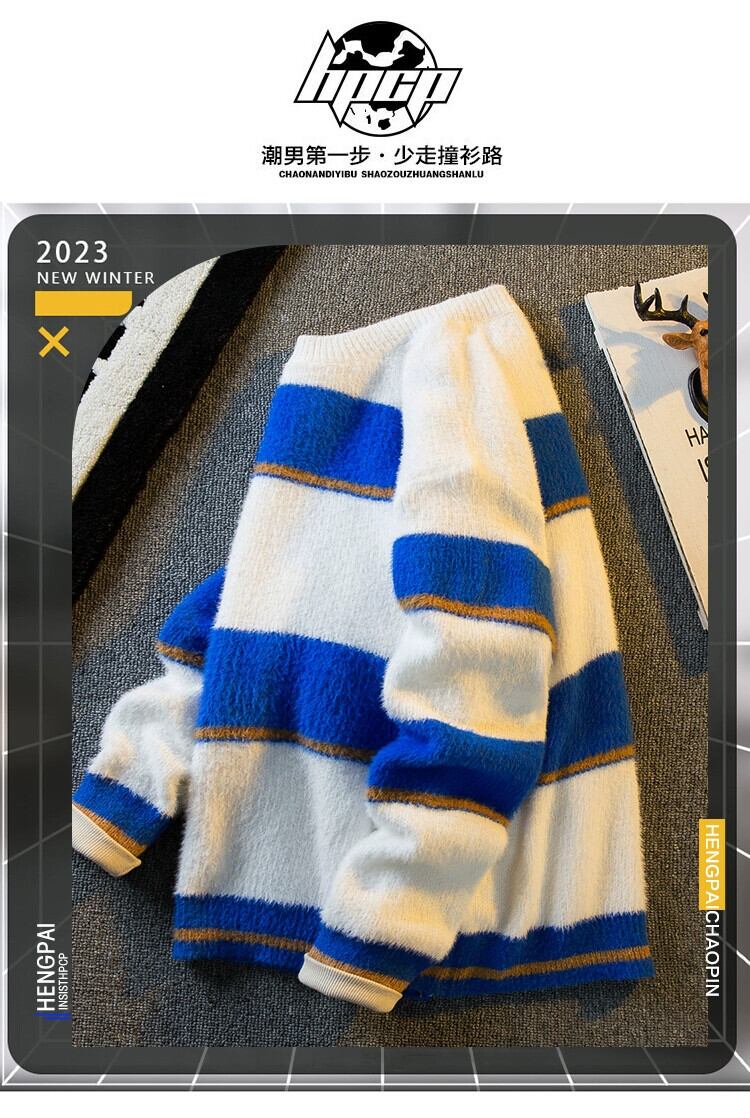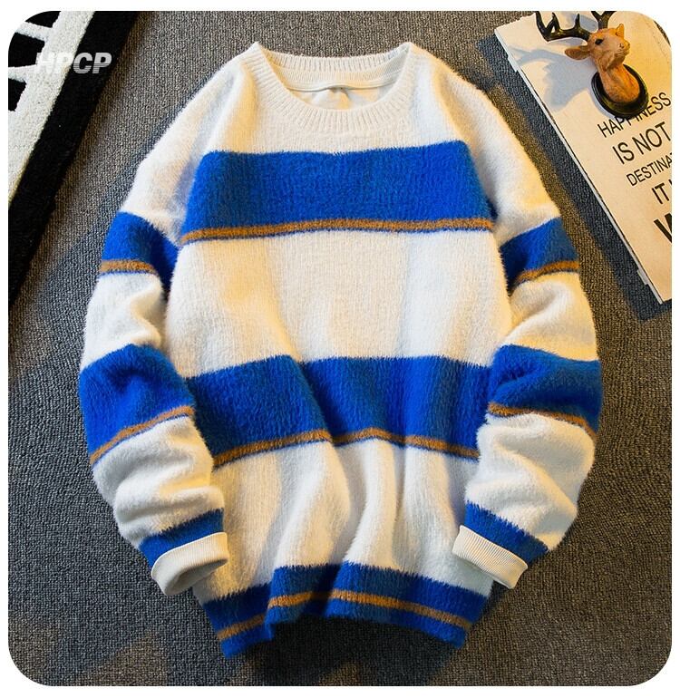 Hengpai トレンディなソフトワックス状イミテーションミンクファー対照的なストライプのセーターメンズトレンディな怠惰なスタイルのカップルプルオーバーセーター秋と冬 オータム 秋物 ウィンター 冬物 3381948650302361