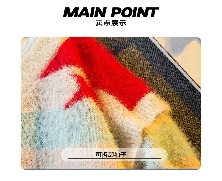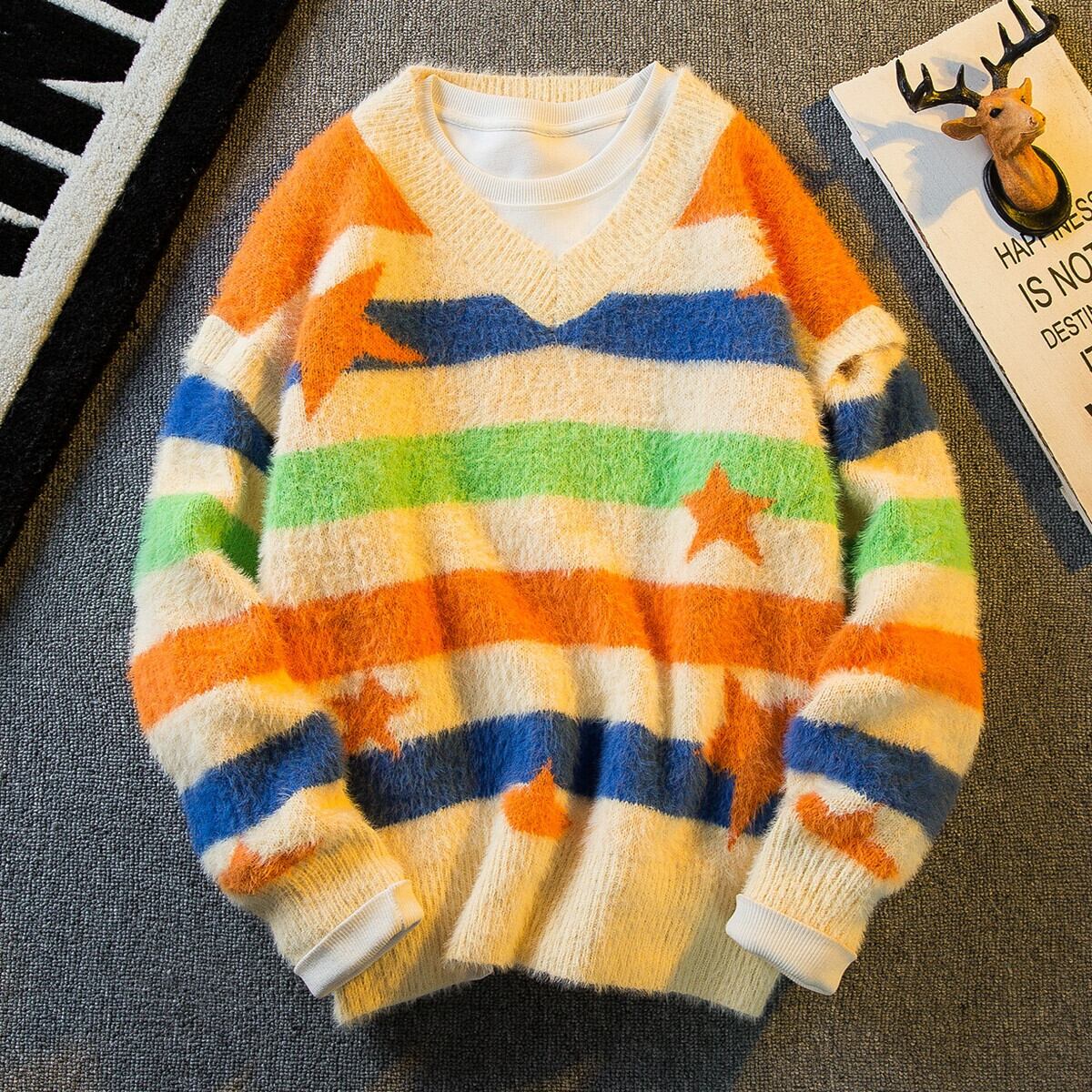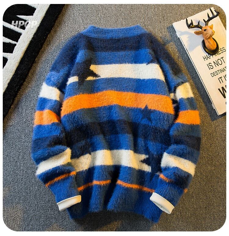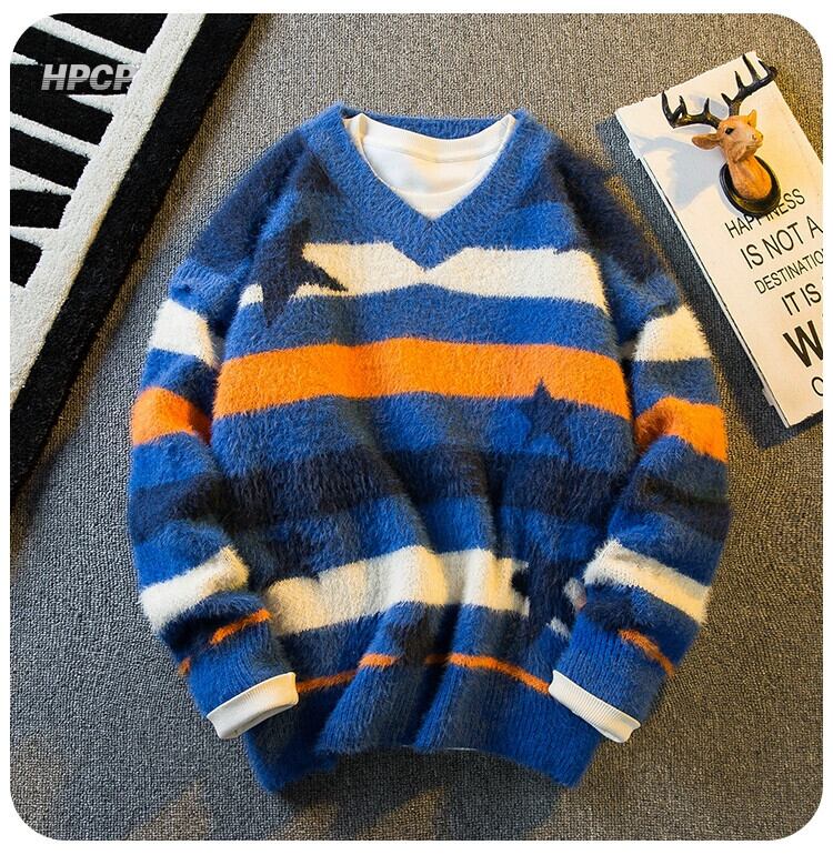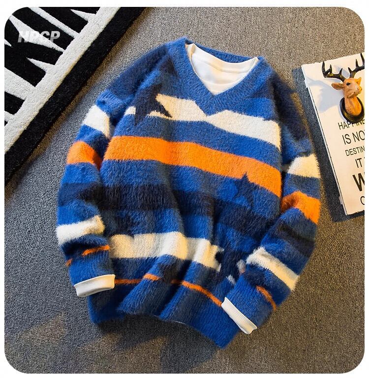 Hengpai トレンディなハイストリート怠惰なモヘアセーターメンズコントラストストライプ V ネックセーターカジュアルカップル毛皮のコート Vネック 3381962905644148