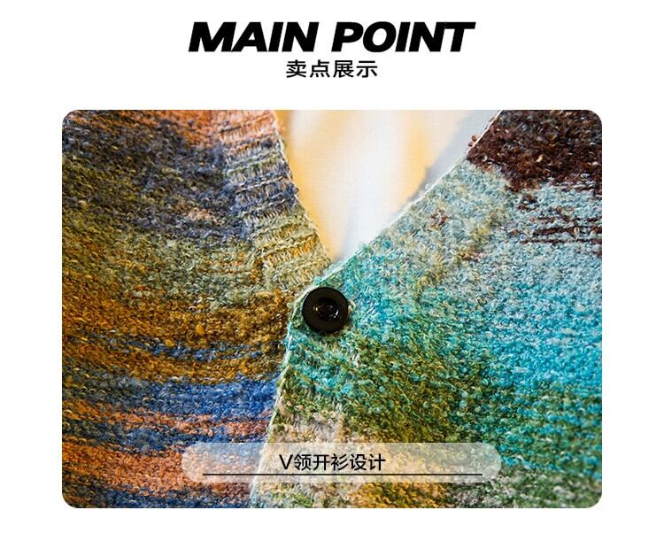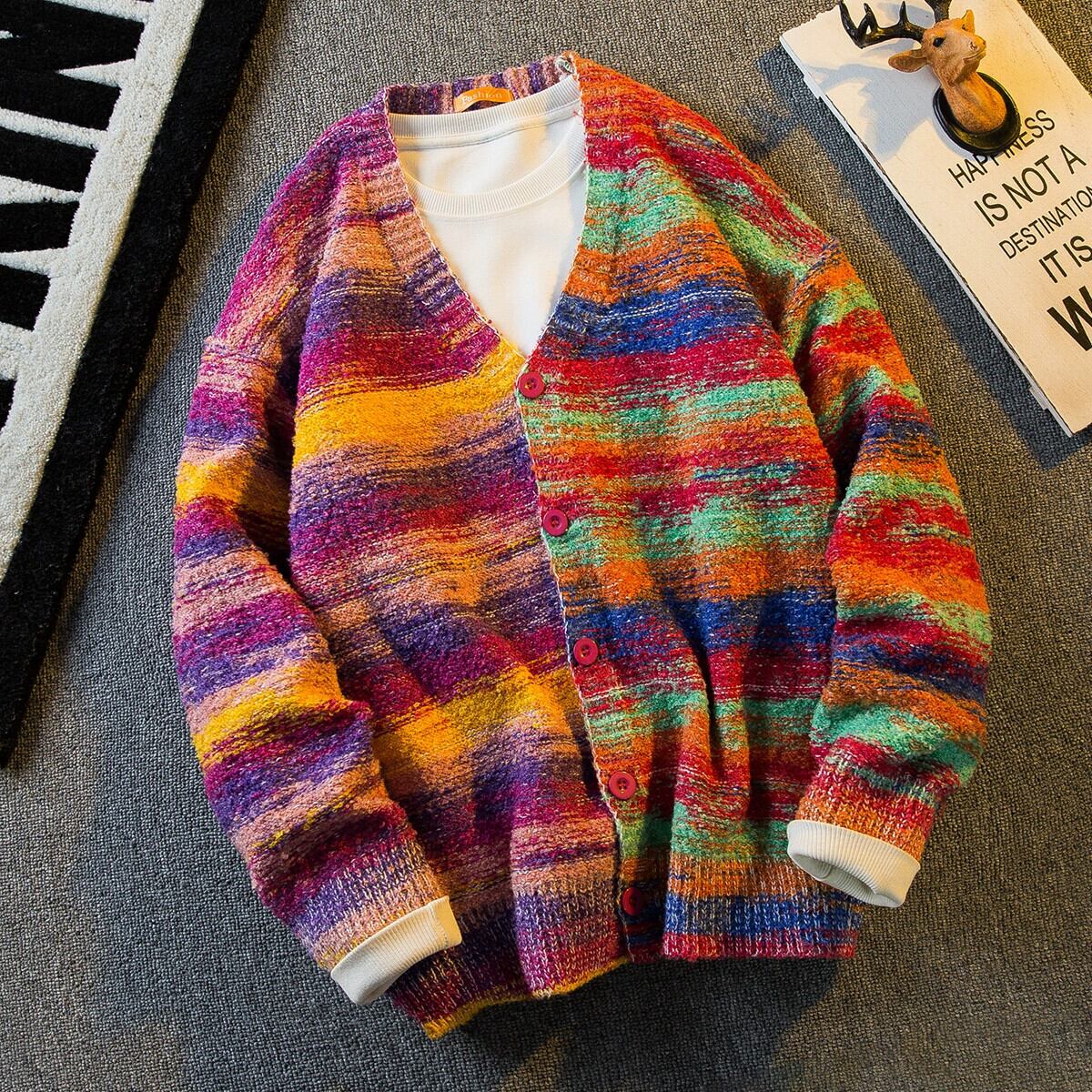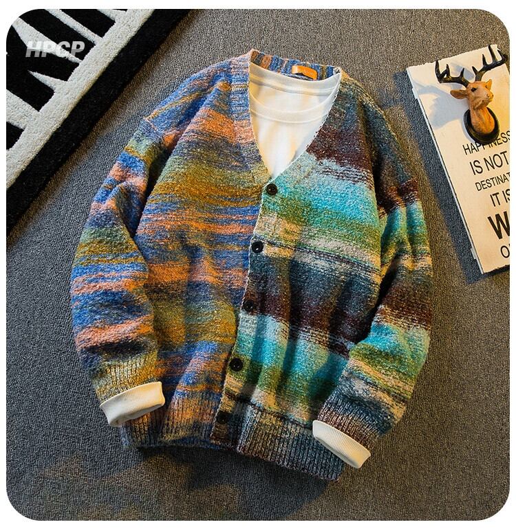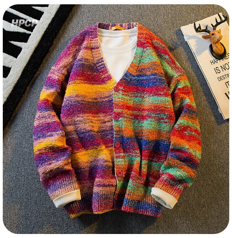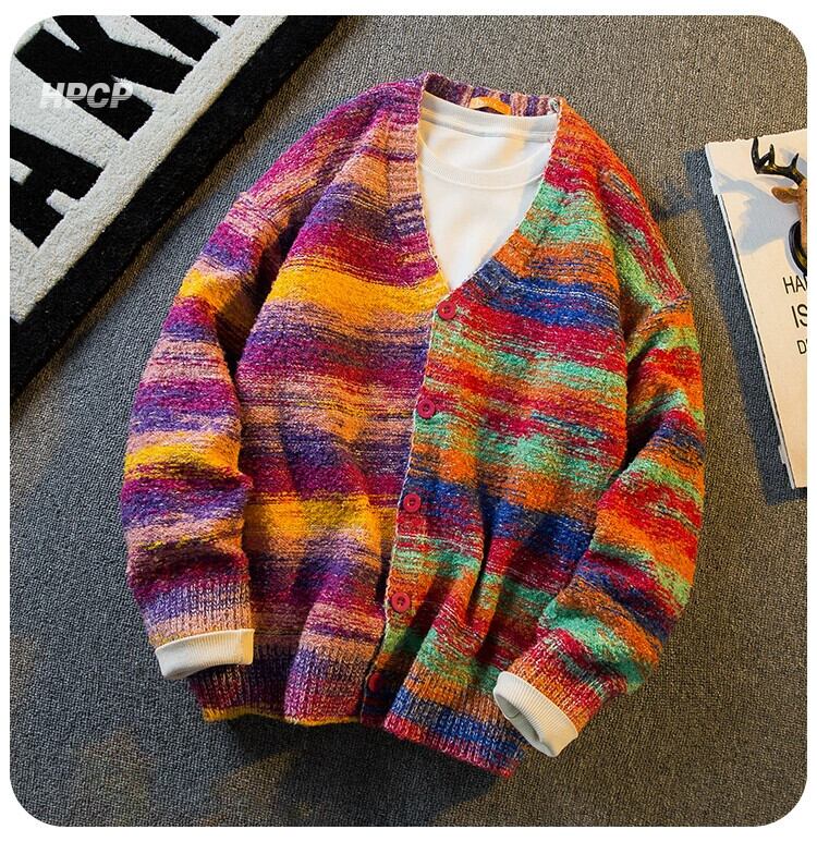 Hengpai トレンディなアメリカン レトロ グラデーション レインボー セーター メンズ秋冬スタイル カップルの怠惰なスタイル カジュアル V ネック セーター オータム 秋物 ウィンター 冬物 Vネック 3381945968240751