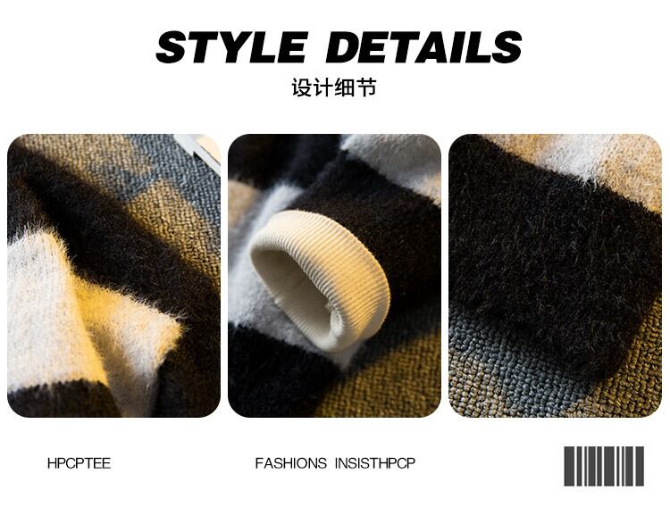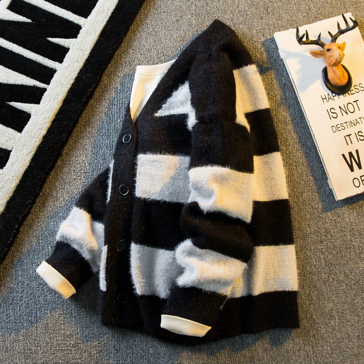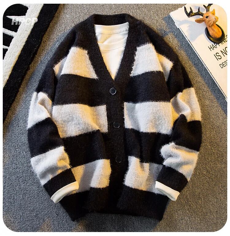 Hengpai トレンディな黒と白のストライプのコントラスト V ネックセーターメンズ冬 2023 新しい怠惰なニットカーディガンジャケット男性 ホワイト ブラック ウィンター 冬物 Vネック 3381969053904351