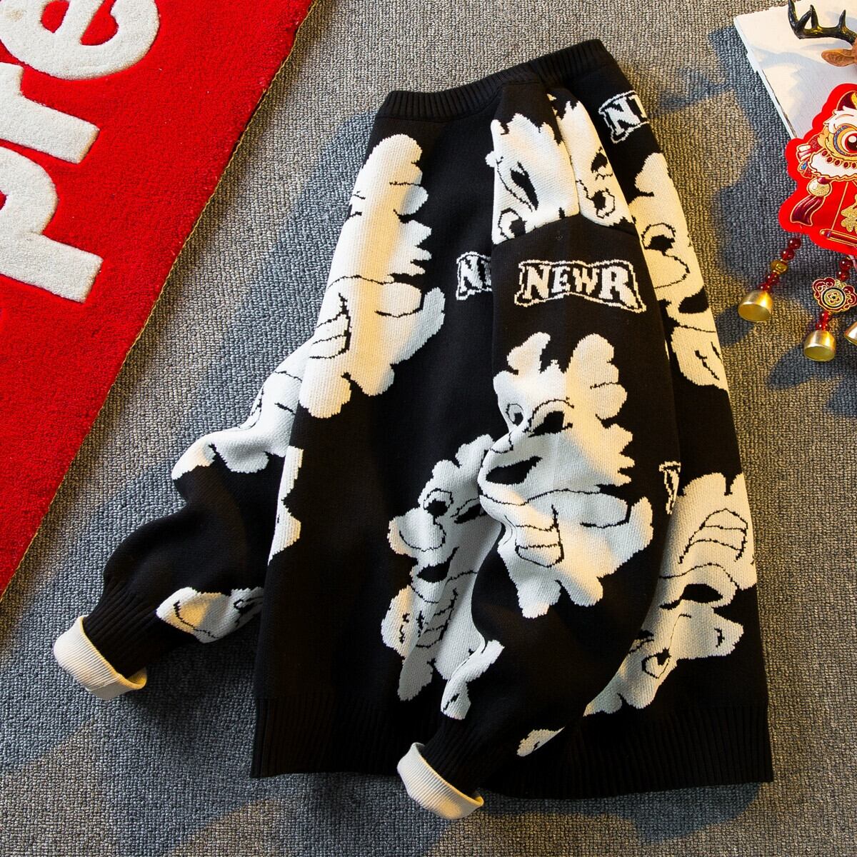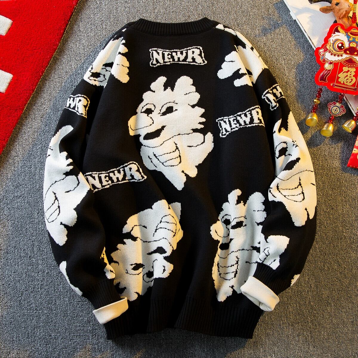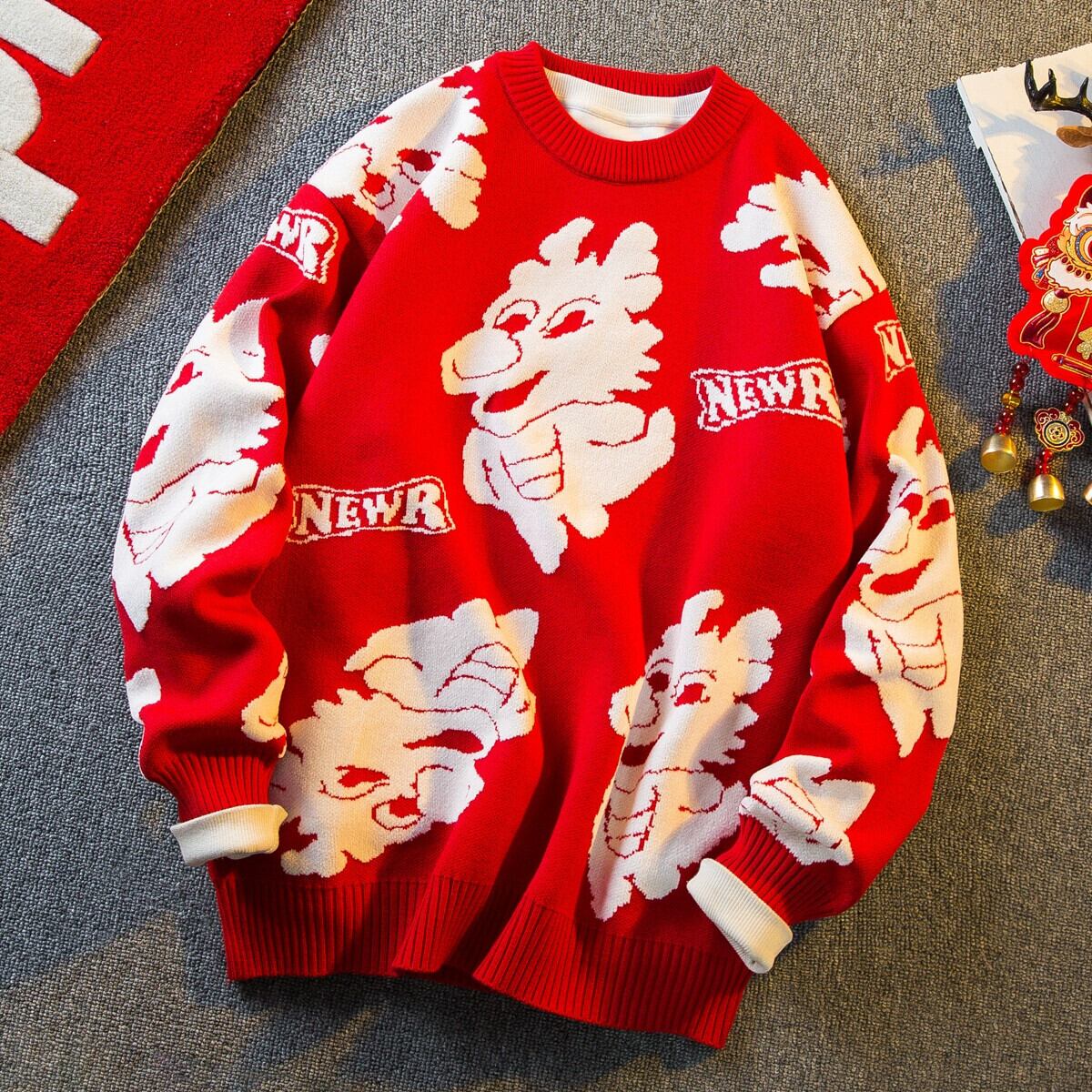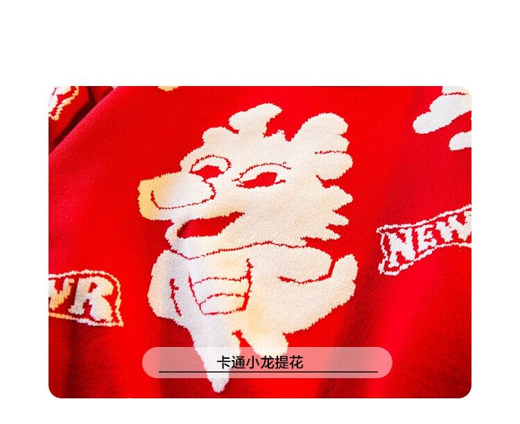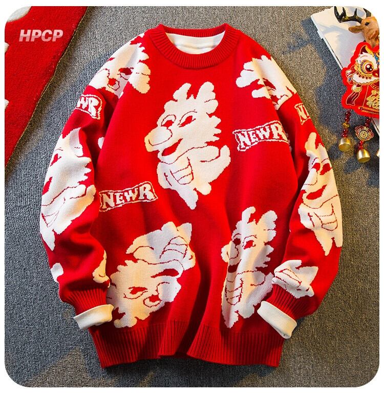 Hengpai トレンディなマゼンタの動物年セーター、秋冬の男性、辰年と春節のデザインセンスのあるセーター厚く暖かいセーター スプリング 春物 オータム 秋物 ウィンター 冬物 3381910173744108