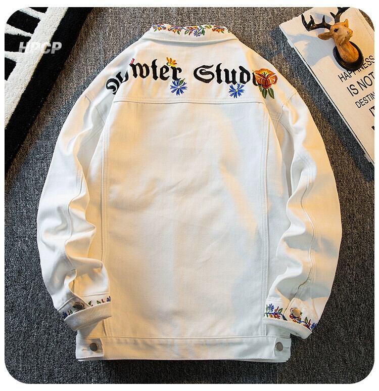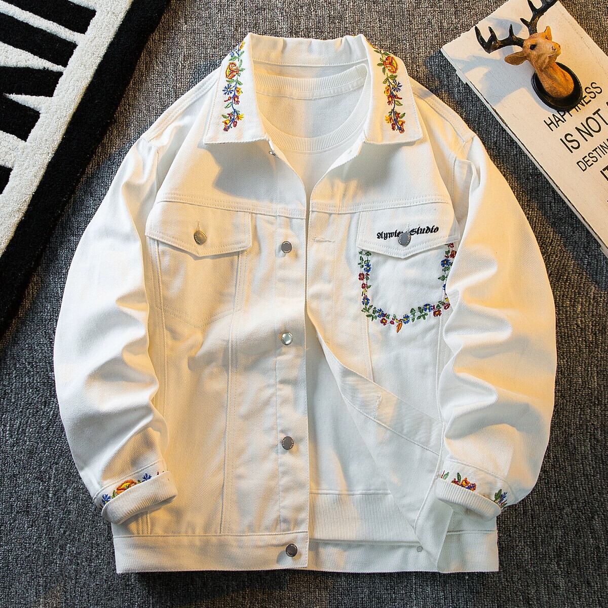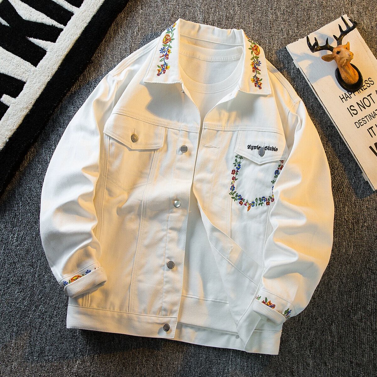 横型トレンディなエーゼスタイルのシンプルな刺繍ラペルデニムジャケットメンズ春秋白通勤ワークジャケットトップ ホワイト レッド スプリング 春物 オータム 秋物 3381914734412298