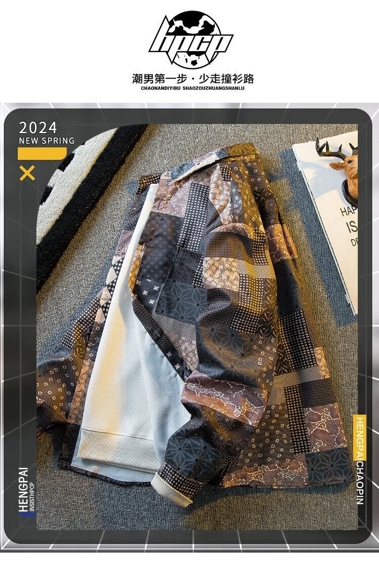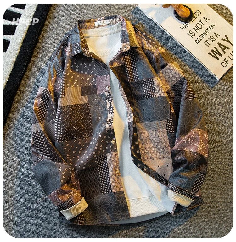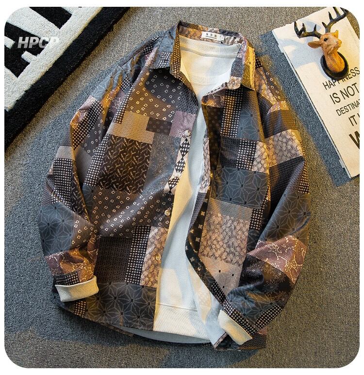 横型アメリカンヴィンテージレトロチェック柄ワークウェア長袖シャツメンズハンサムルーズシャツジャケット ロング ビンテージ 3381992271727056