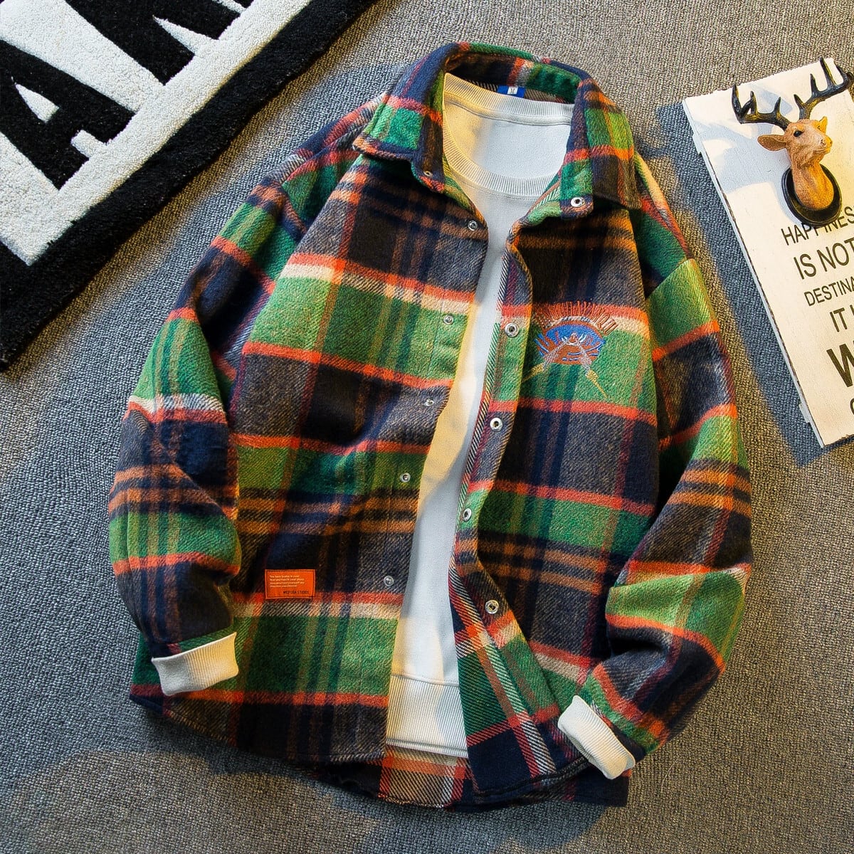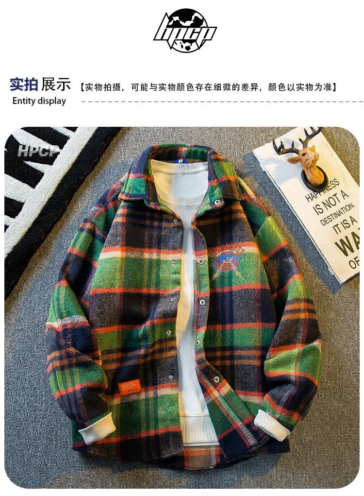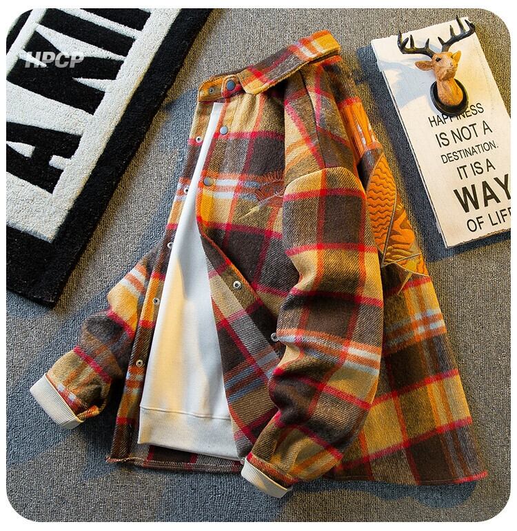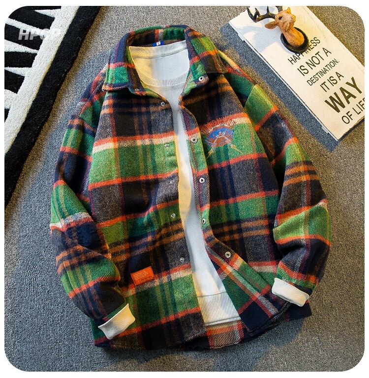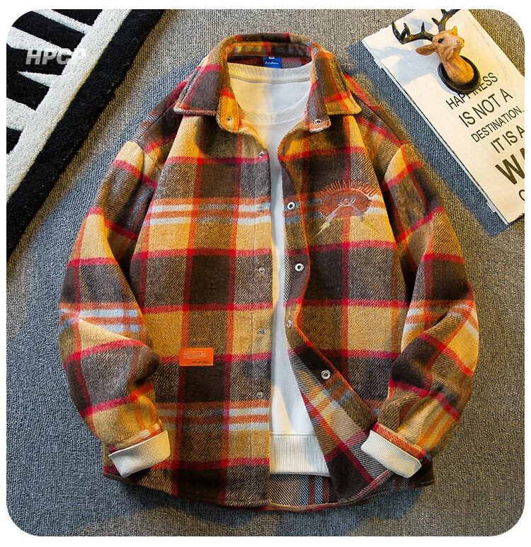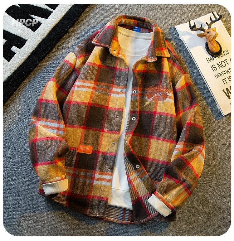 水平アメリカのレトロな重工業刺繍長袖ウールチェック柄シャツメンズ春と秋のファッションブランド起毛シャツジャケット ロング レッド スプリング 春物 オータム 秋物 3381964553706925