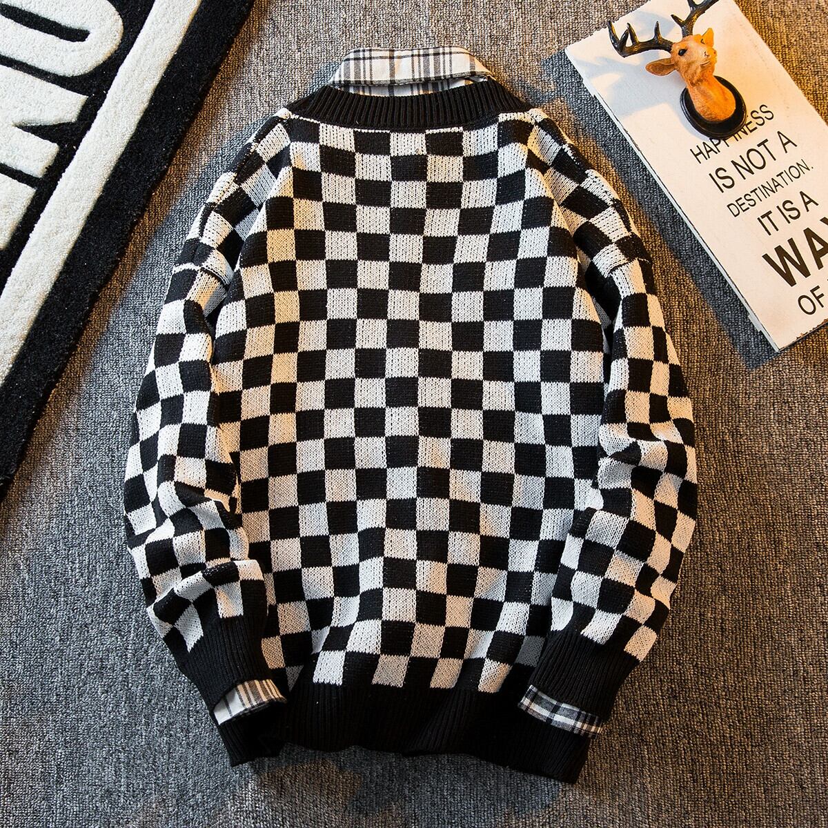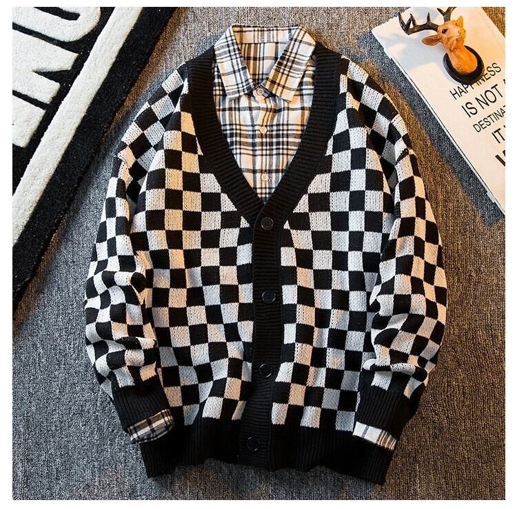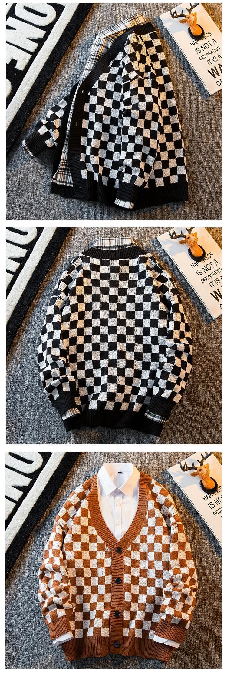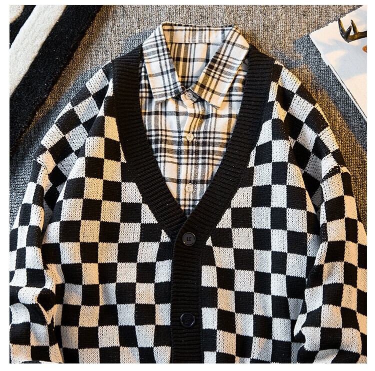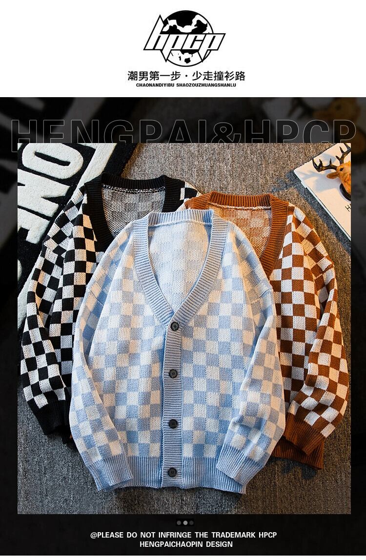 HPCP ese レトロチェック柄カーディガンセーターメンズ冬トレンディなアメリカのハイストリートチェッカーボードチェッカーセータージャケット男性 ウィンター 冬物 3381935514122351